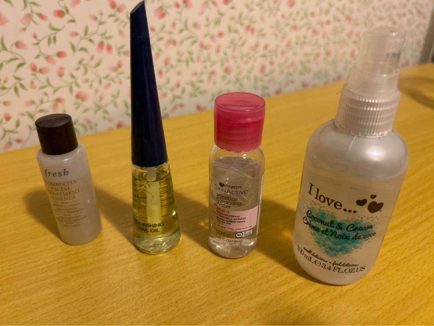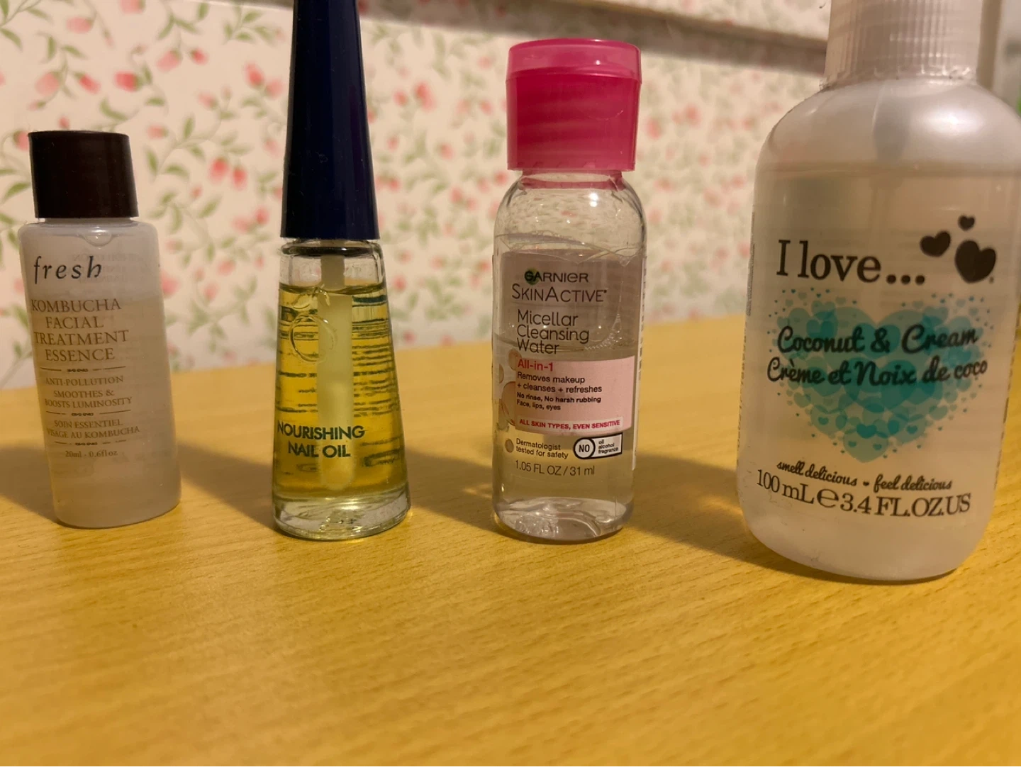 Travel-sized skincare set including Fresh Kombucha Facial Treatment Essence (30ml), Nourishing Nail Oil, Garnier SkinActive Micellar Cleansing Water (31ml), and I Love... Coconut & Cream Body Lotion (100ml). Perfect for a quick refresh on the go!