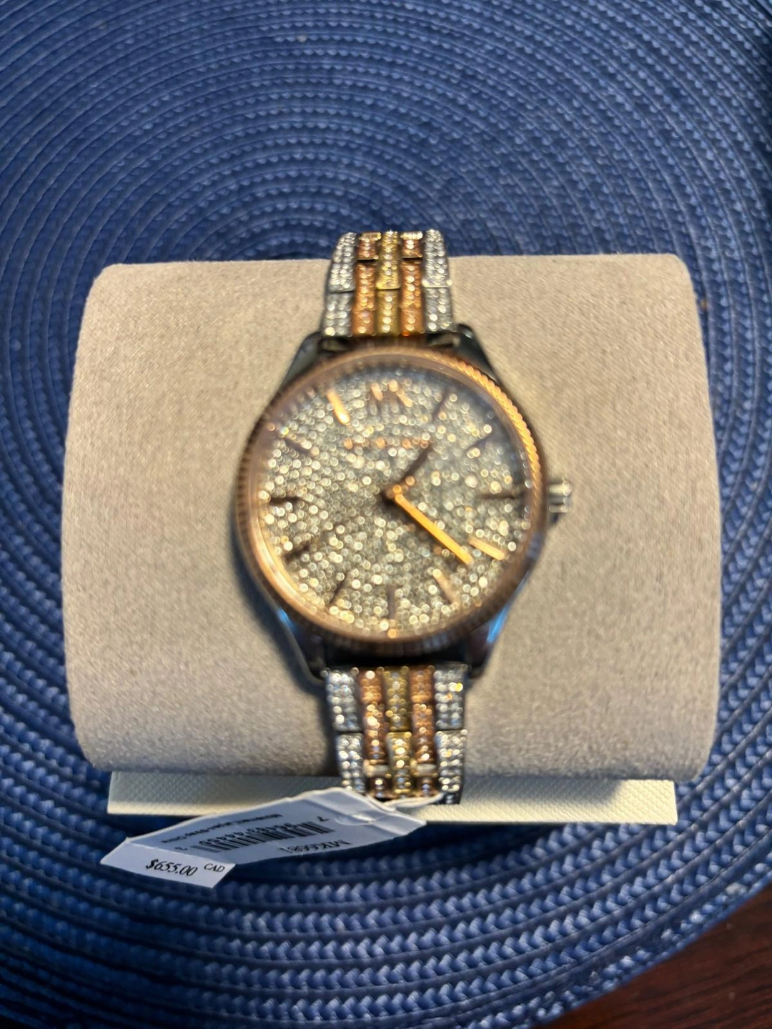 This is a Michael Kors women's watch with a rose gold face and crystal accents. The band is a mix of silver, rose gold, and gold. It is in a brand new condition.