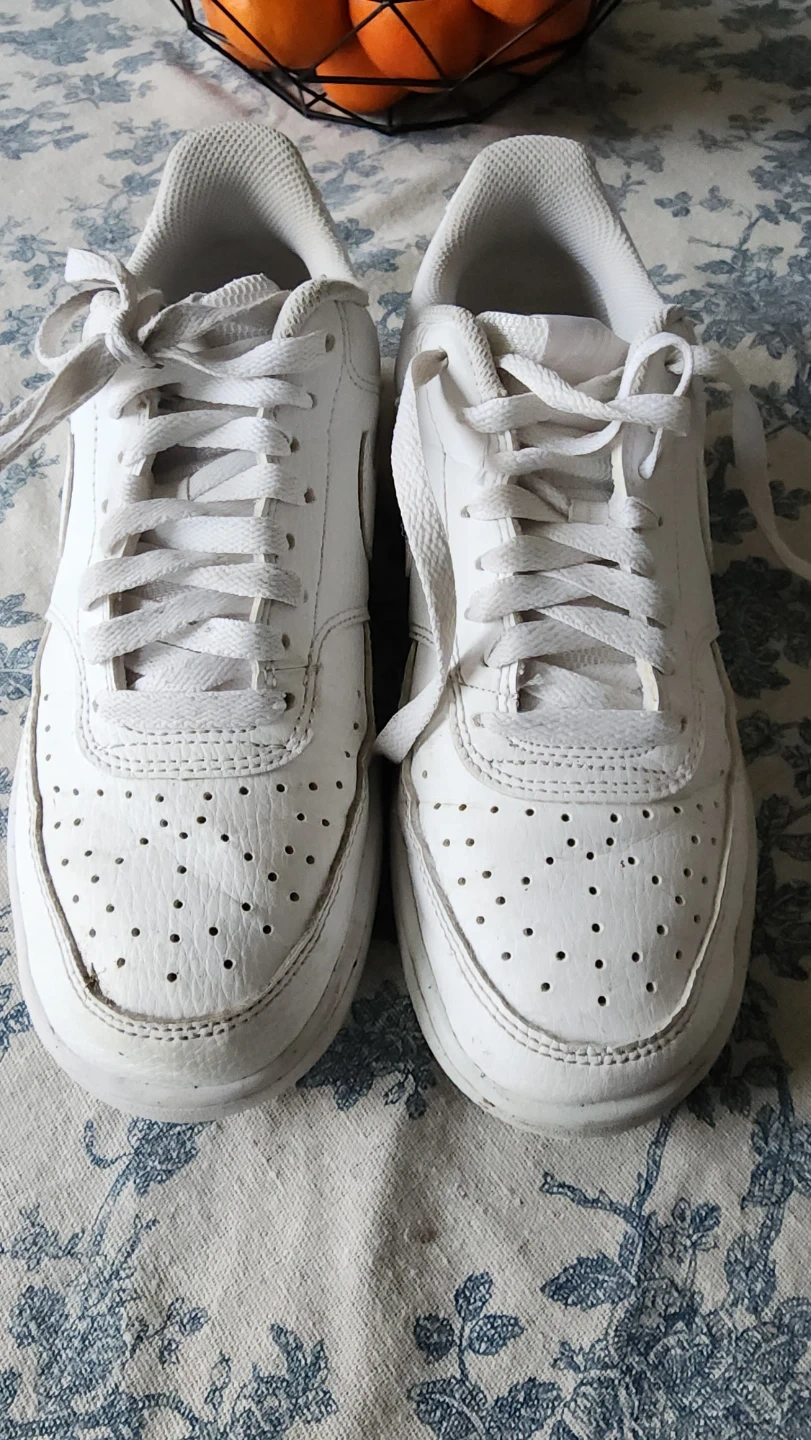 White leather Nike Court Vision Low sneakers for men. US size 8 (EUR 39, UK 5.5). Used as indoor shoes for my daughter. In great shape barely broken in.