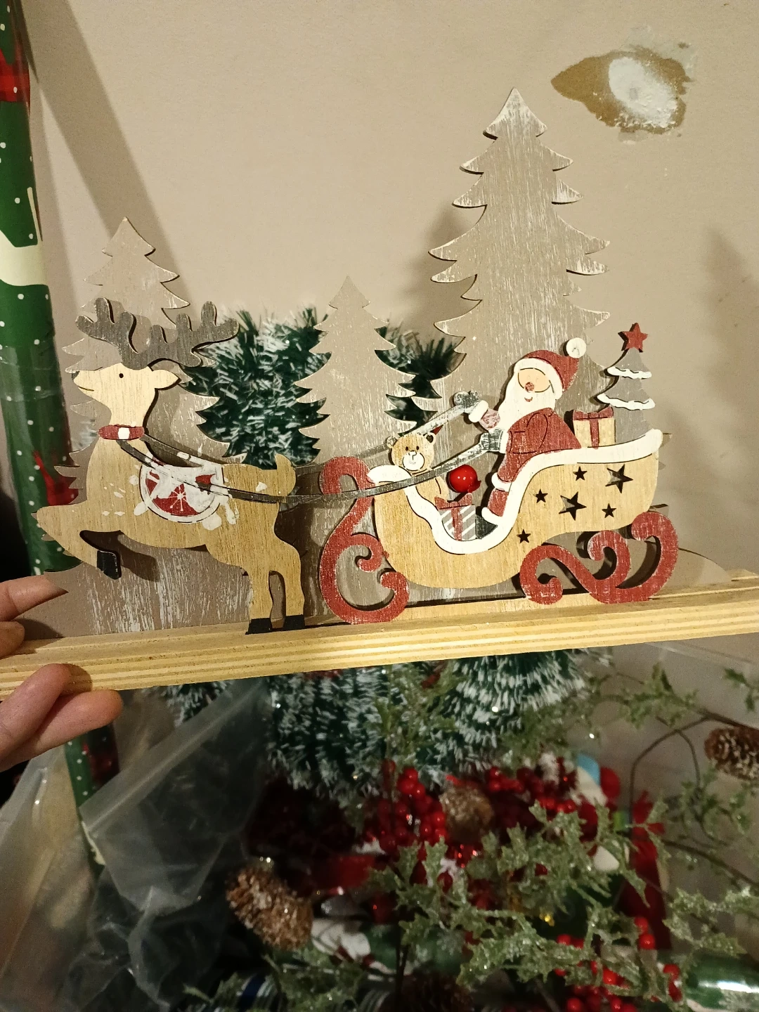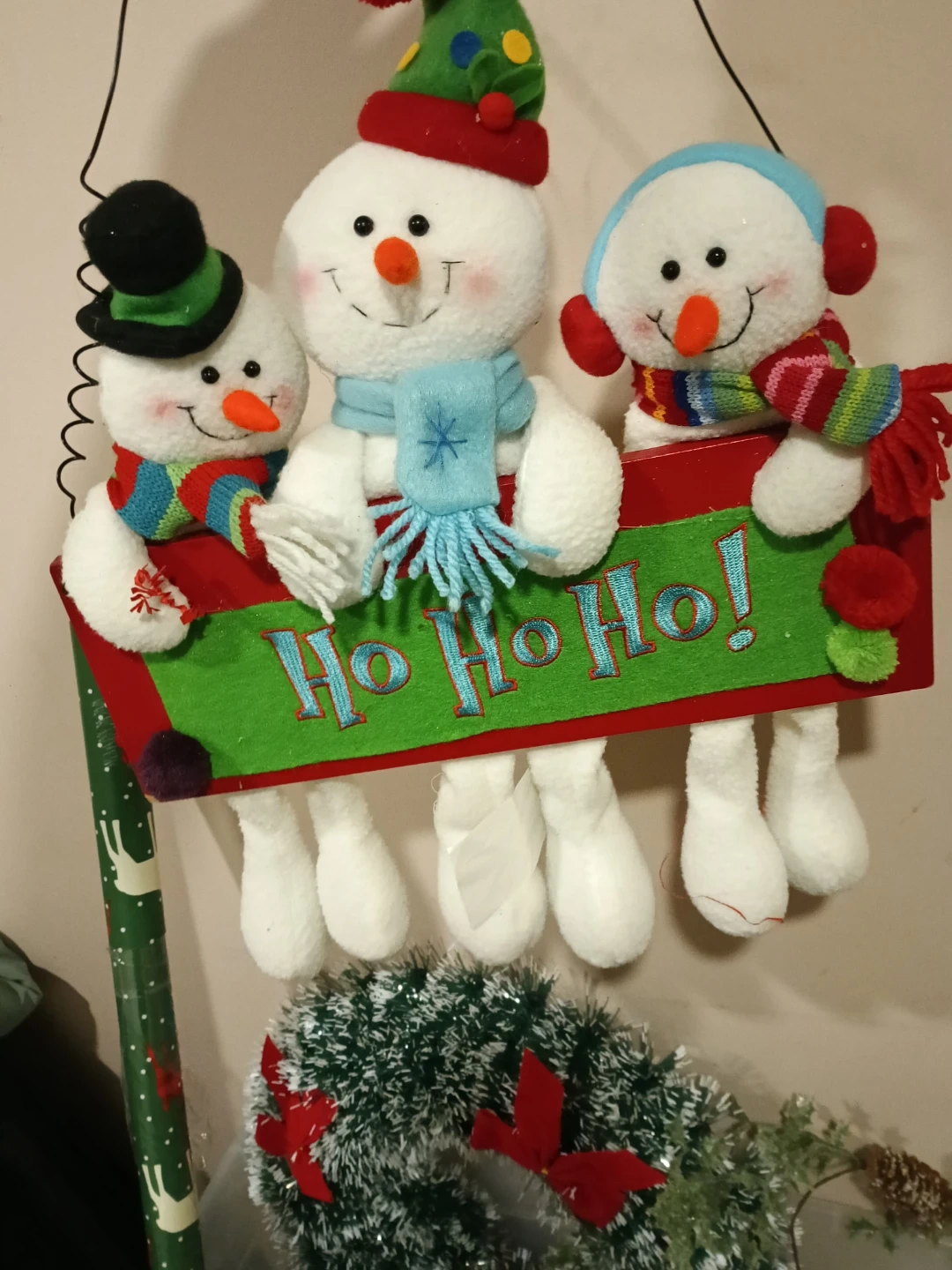 This lot includes a variety of Christmas decorations. You'll find a fluffy wreath with red bows, a wooden Santa sleigh with reindeer, and plush snowmen holding a 'Ho Ho Ho' sign. Also includes a bag of black hanging clips and a bin of assorted baubles in red, gold, and silver.