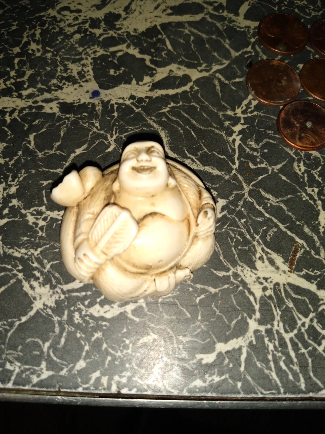 This is a very special and rare find, it is an antique hand-carved ivory laughing Buddha, it is small about 2 in by 2 in laughing Buddha netsuku , this hotei is from the Meiji period and very very valuable. Others similar have sold at auction for thousands.