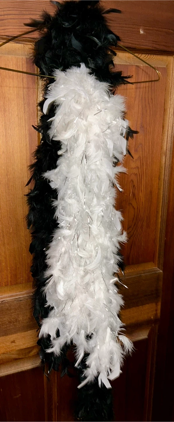 A striking feather boa in pitch black and another feather boa that is white accented with silver tinsel. Soft feathers are perfect for costumes or festive occasions. Adds a touch of glamour to any outfit!