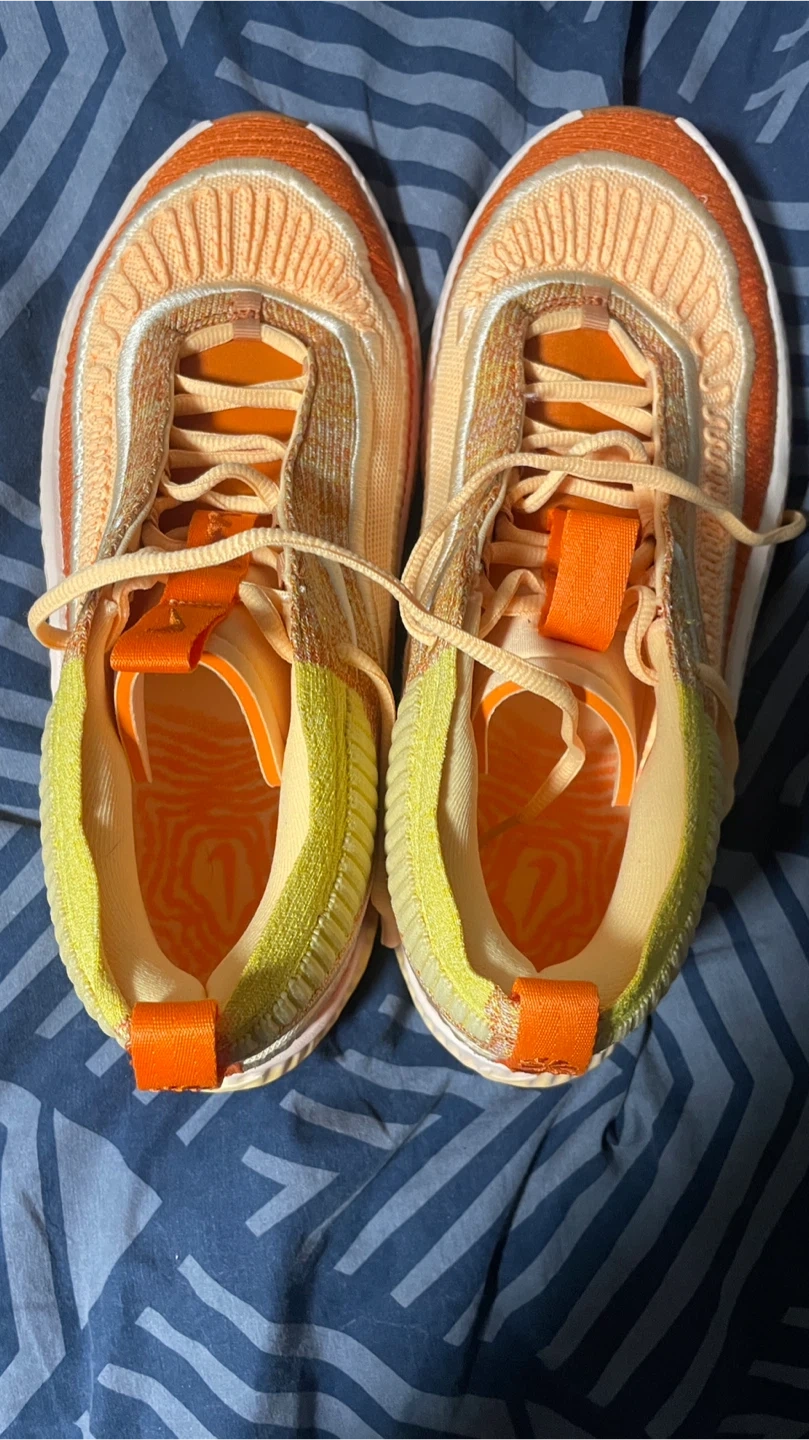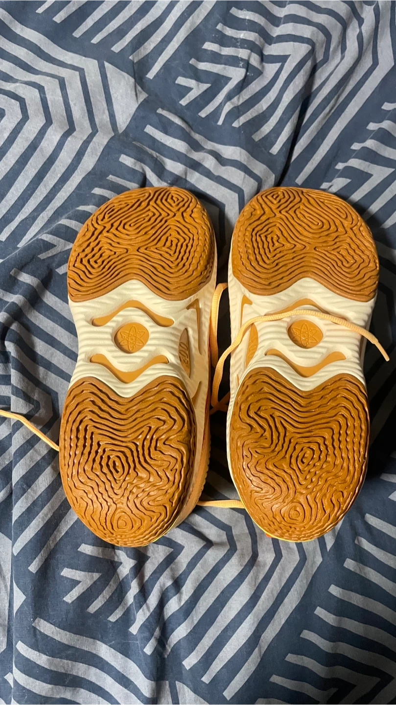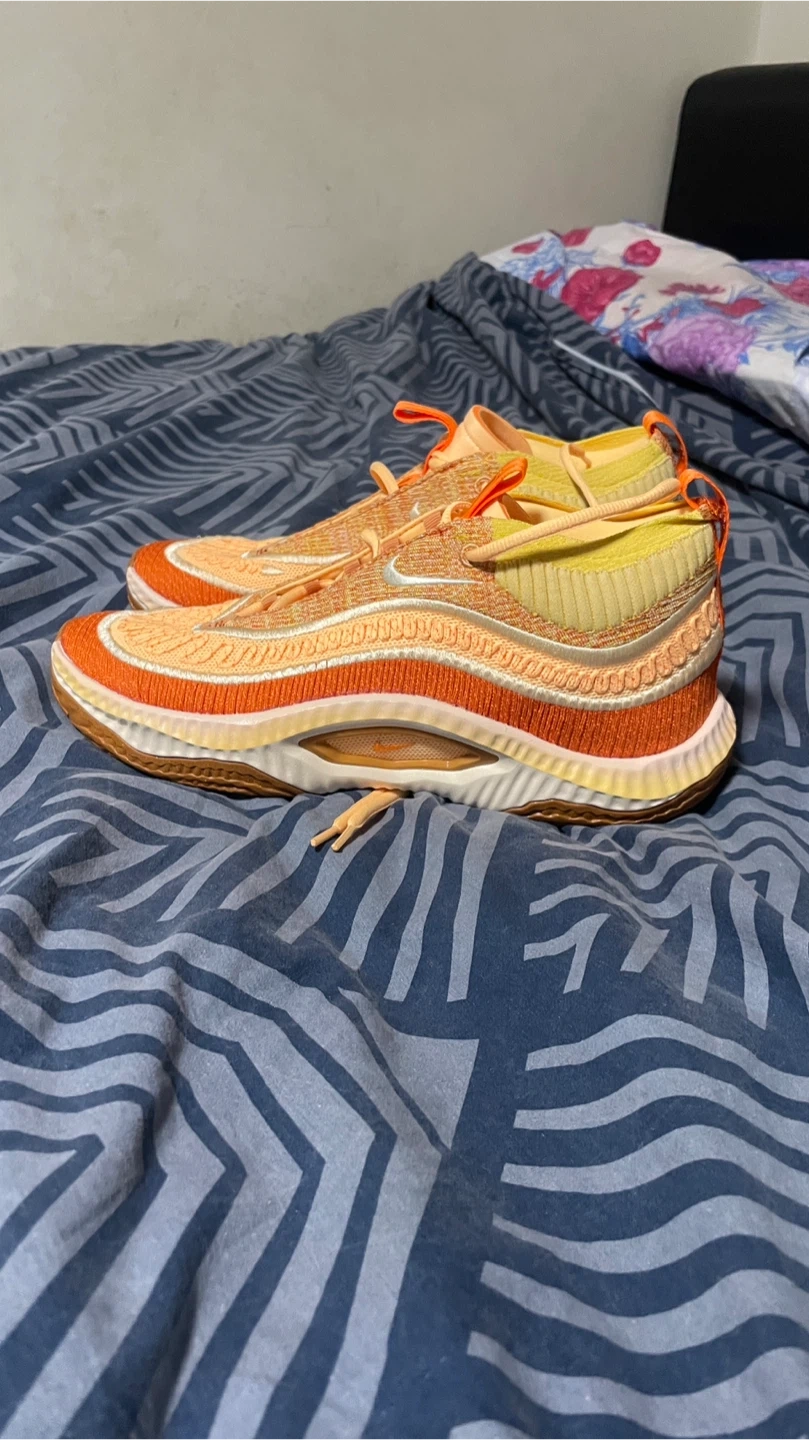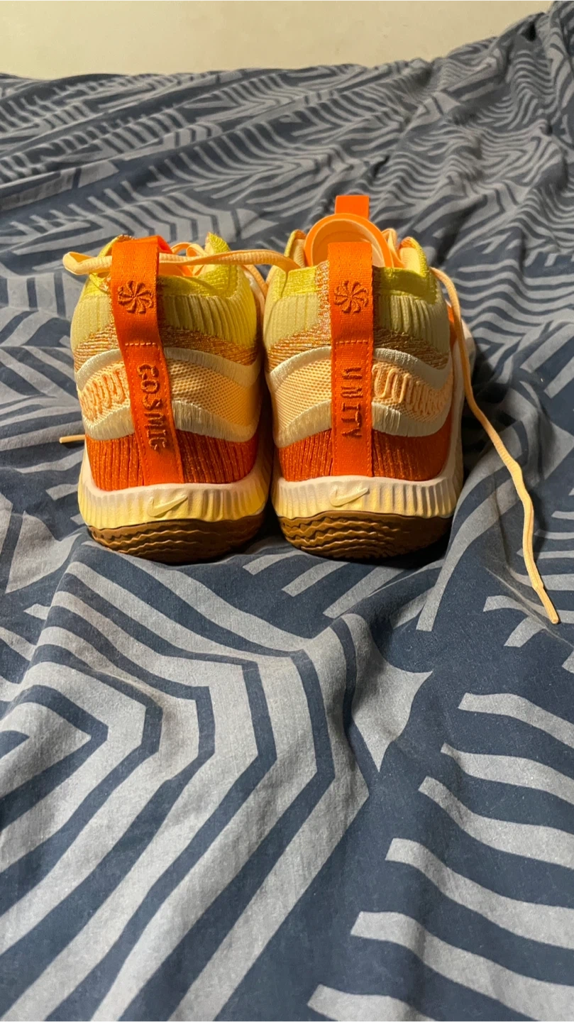 These Nike basketball shoes are a size 10.5. They feature a knit upper and a rubber outsole for traction. The bright orange and yellow colourway is eye-catching!