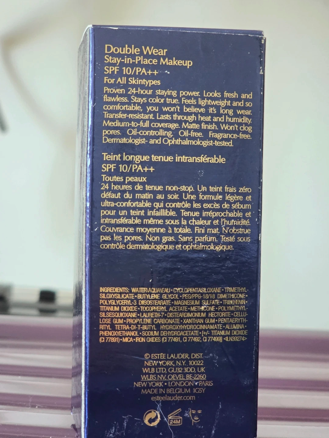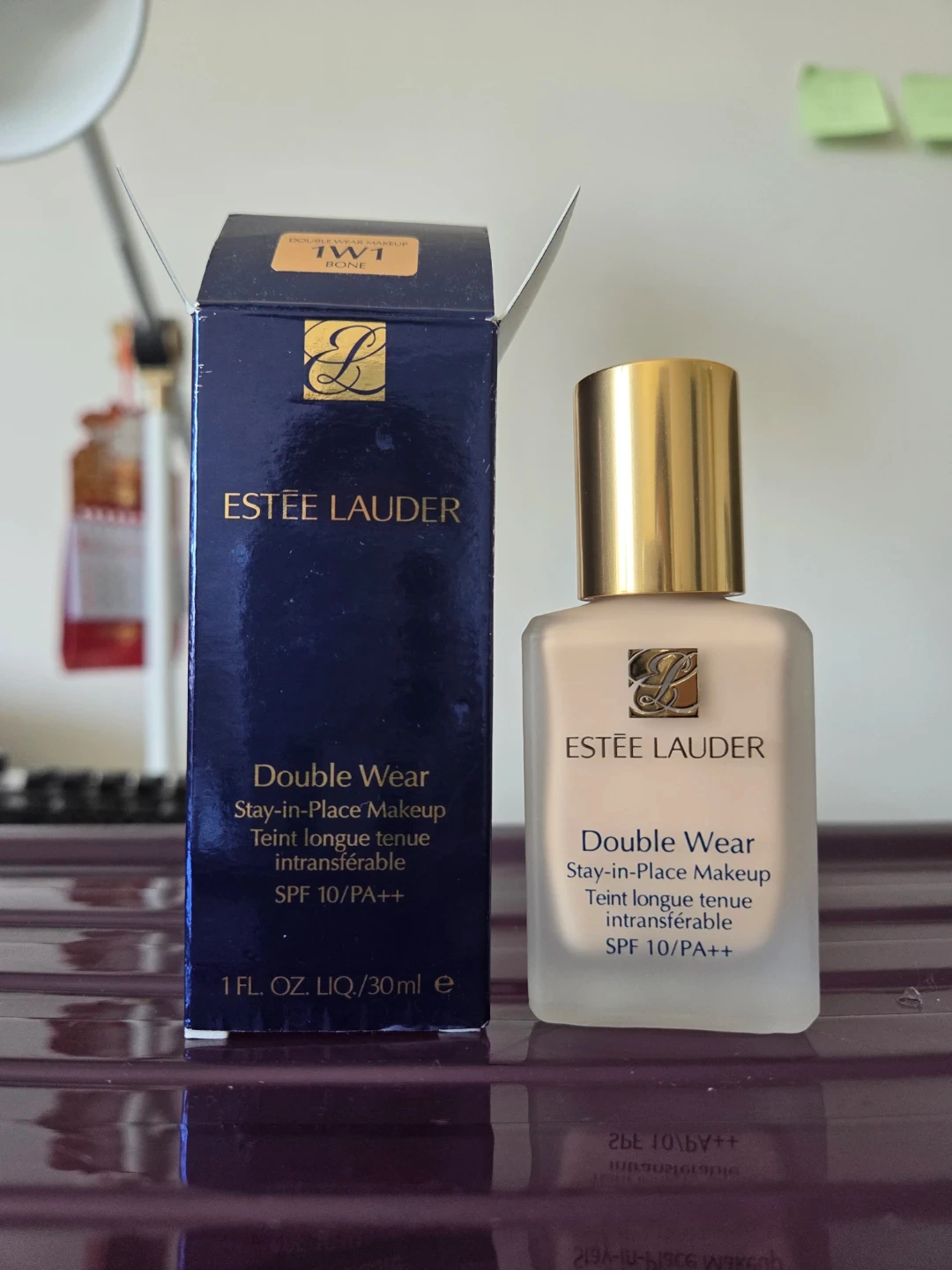 Estée Lauder Double Wear Stay-in-Place Makeup in shade 1W1 Bone. It offers proven 24-hour staying power with a lightweight, transfer-resistant formula. This makeup has a matte finish