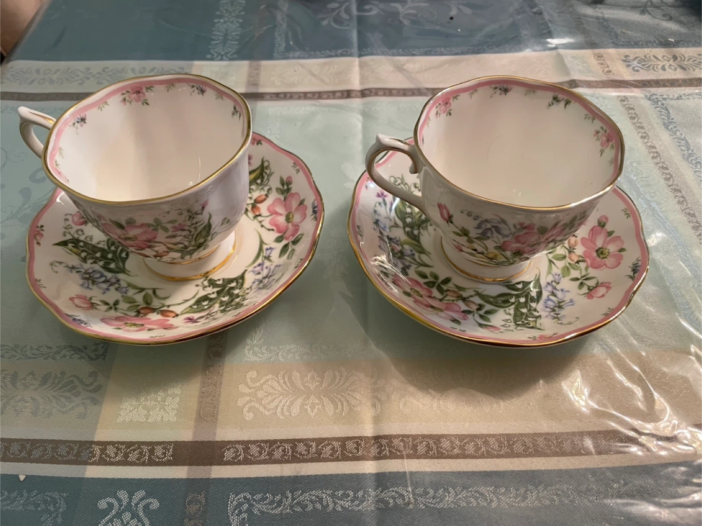 Set of two Royal Albert "Morning Dew" fine bone china teacups and saucers. This collection features a delicate floral design with pink accents and gold trim.