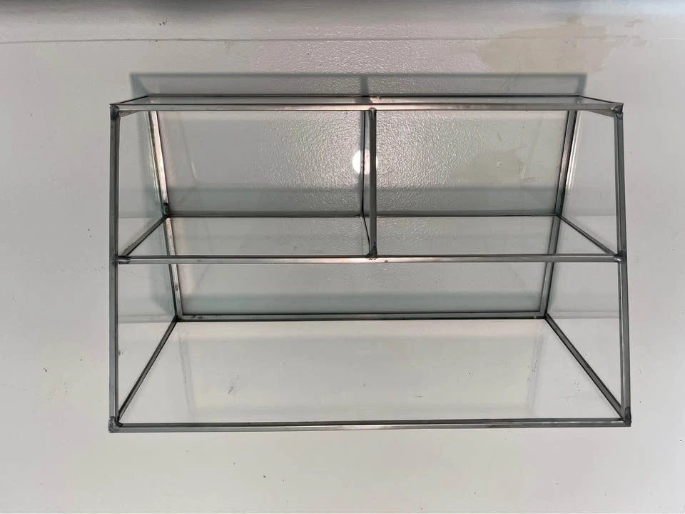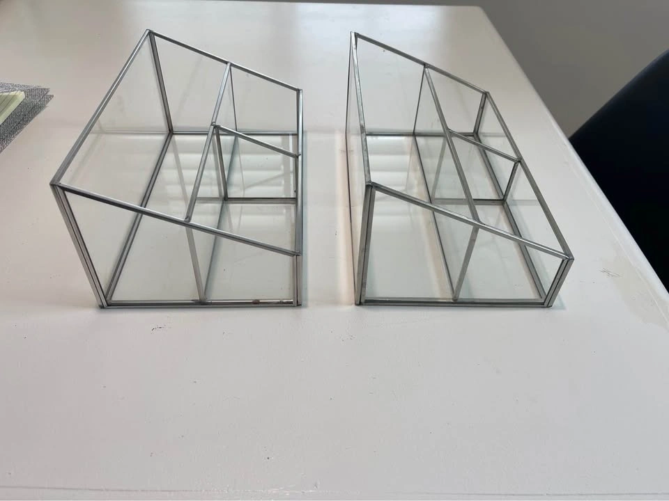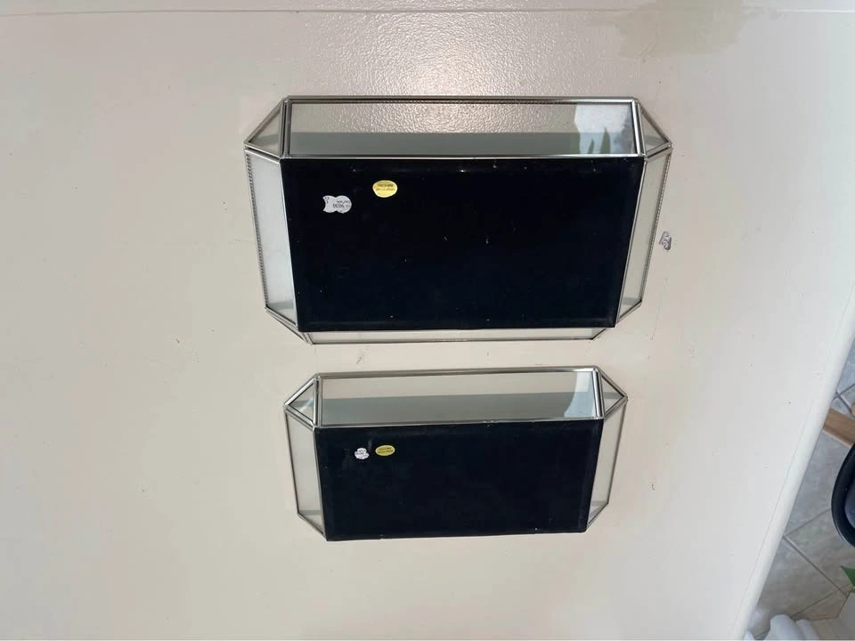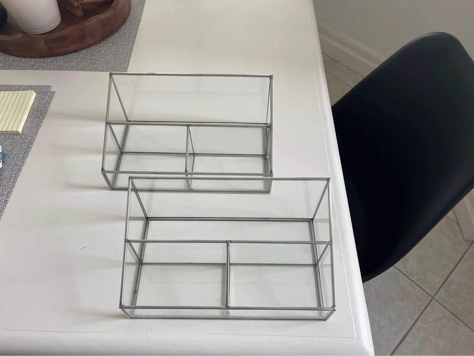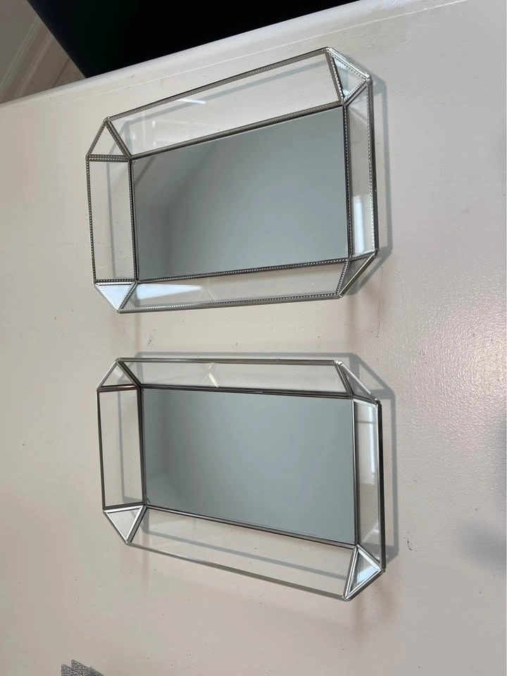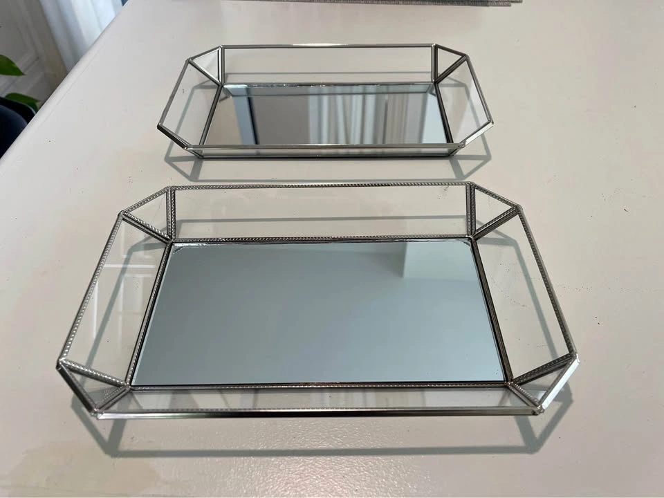 Two glass/mirror trays with felt bottoms and metal edges. Two makeup organizers, both glass with metal edges. No chips, in very good condition. Trays L 11”xD 7”. Organizer L 10” x D 8 1/2 “.