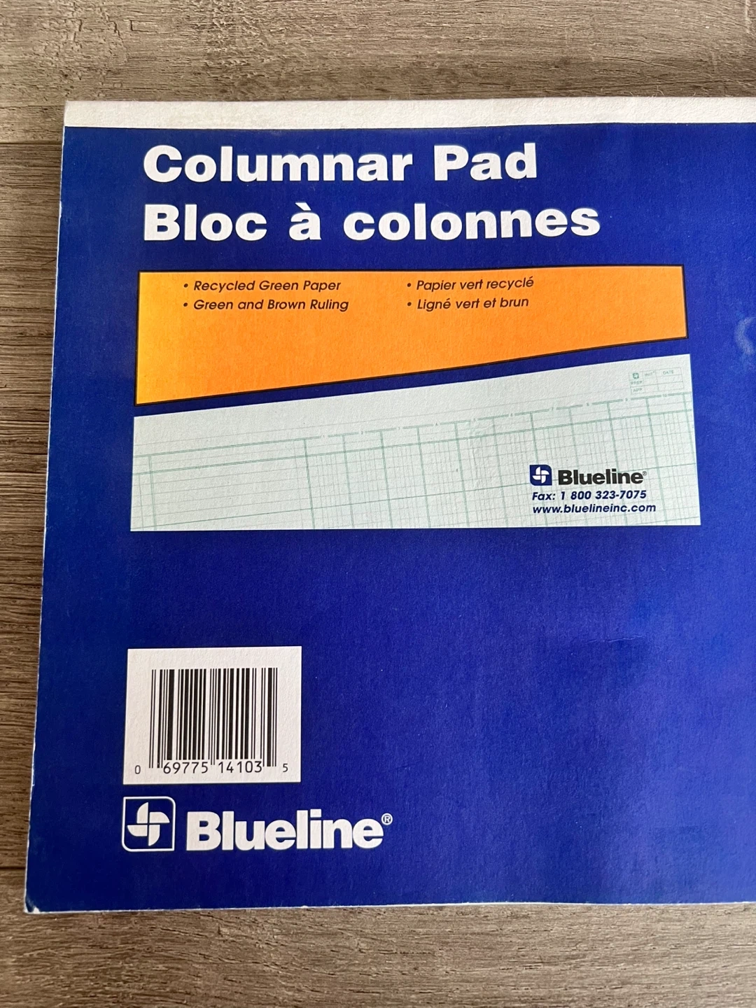 This is a Blueline A4012 columnar pad. It features 12 columns and recycled green paper with green and brown ruling. The pad measures 14 x 8 3/4 inches (35.5 cm x 22.3 cm).