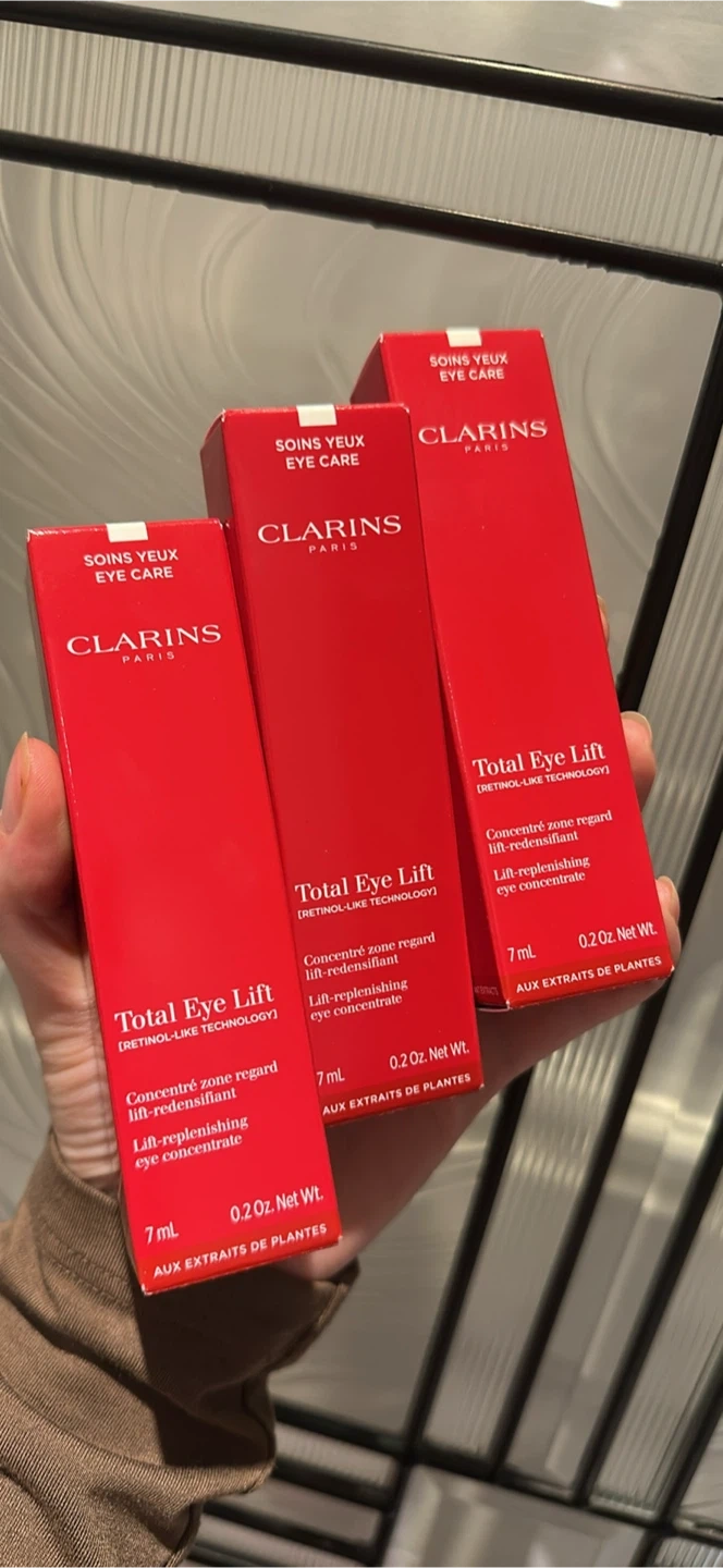 This is a pack of three Clarins Total Eye Lift concentrates. Each is a 7ml bottle with retinol-like technology. It's a lift-replenishing eye concentrate made with plant extracts.