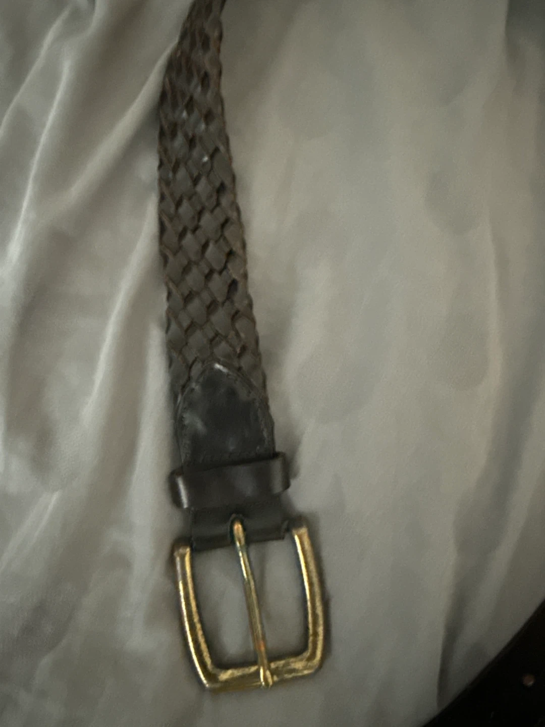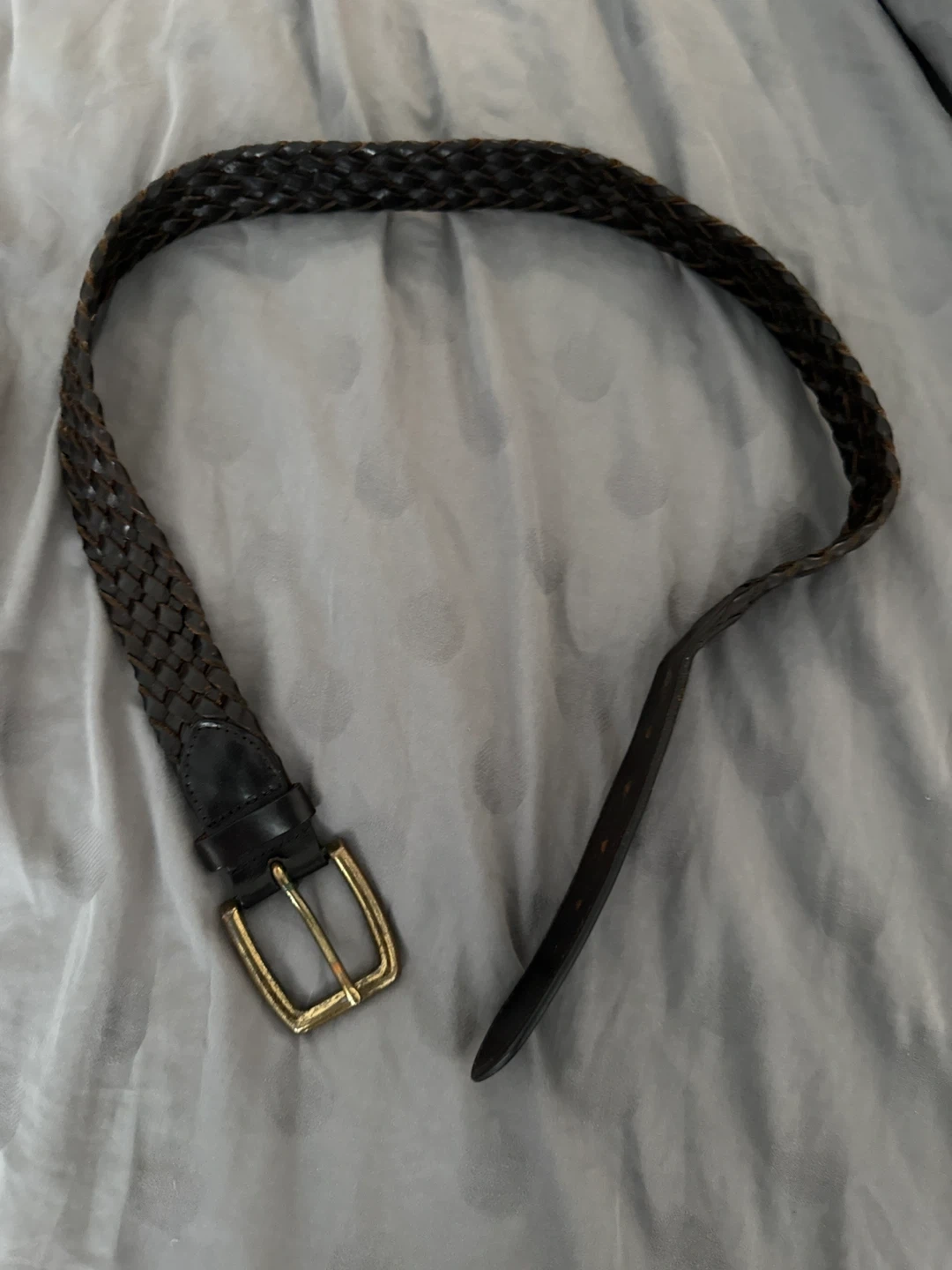 Classic brown belt with a braided woven leather design. Features a gold-tone buckle and leather keepers. It's a versatile accessory for any outfit!