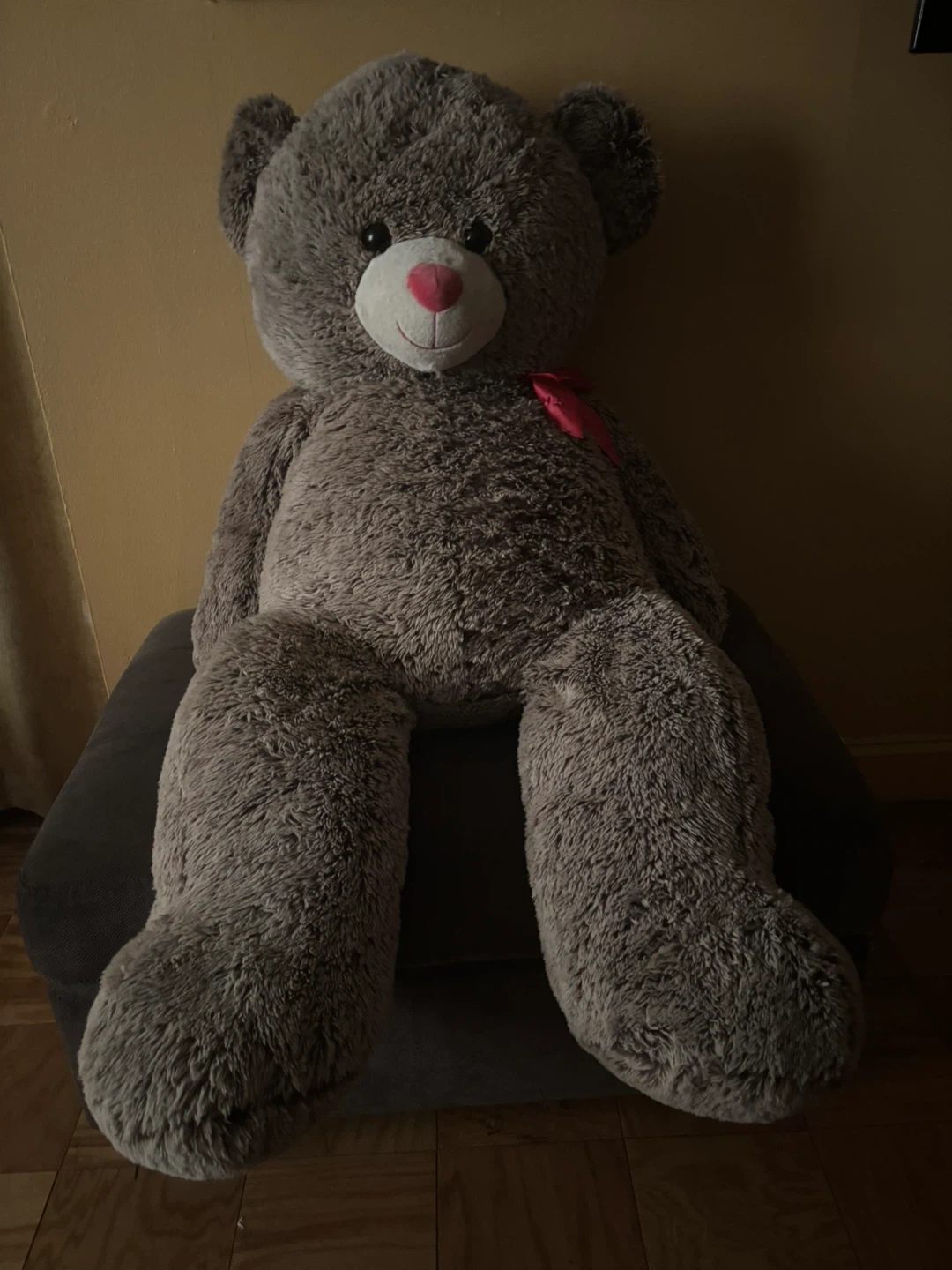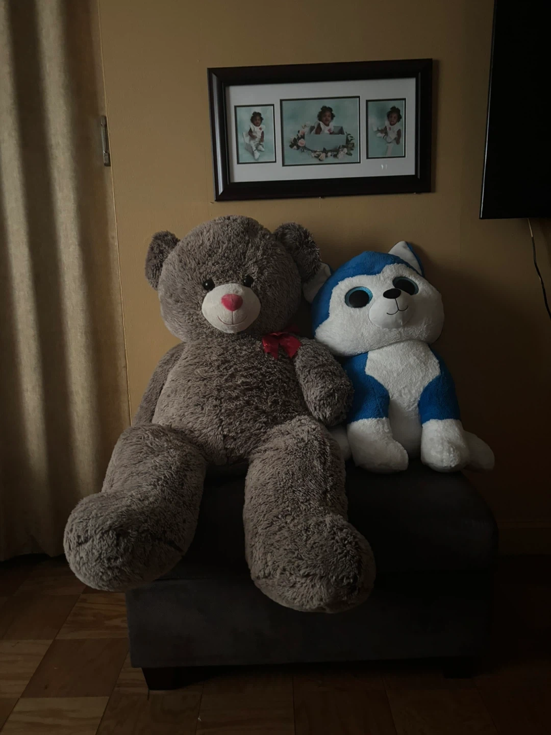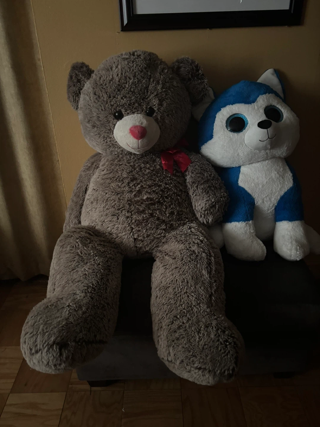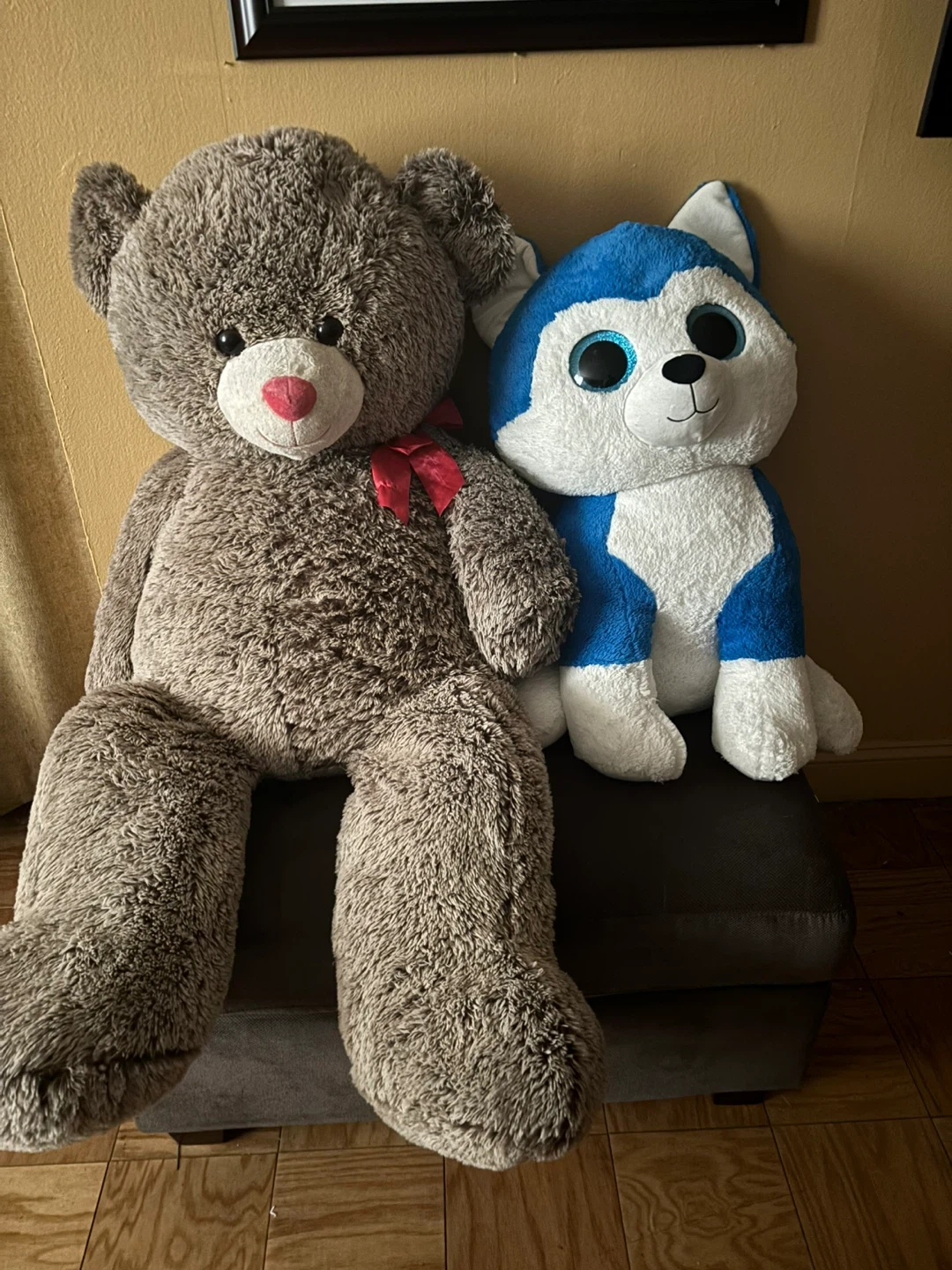 This listing includes a giant brown teddy bear and a blue and white husky plush toy. Both stuffed animals are soft and cuddly, perfect for decoration or play. The teddy bear has a red bow and pink nose. The husky has big blue eyes. Teddy bear is 5 feet tall and the husky is 3 feet tall…Both for $20