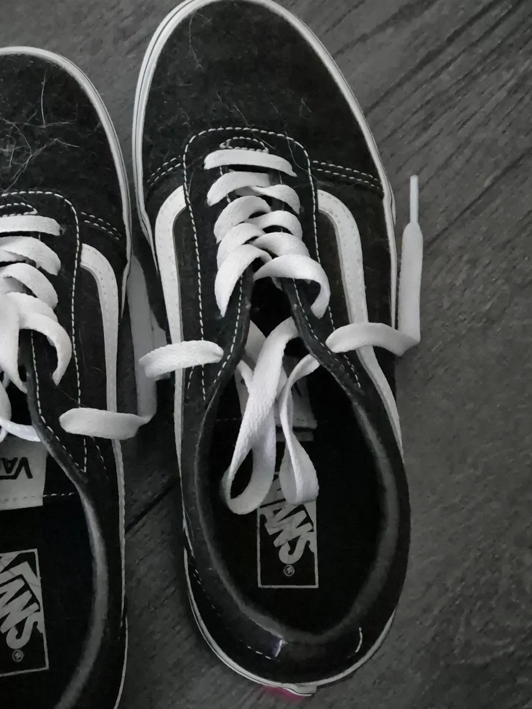 Classic black and white Vans Old Skool sneakers. Lace-up closure for a secure fit. Durable canvas and suede construction. These are a versatile everyday shoe!