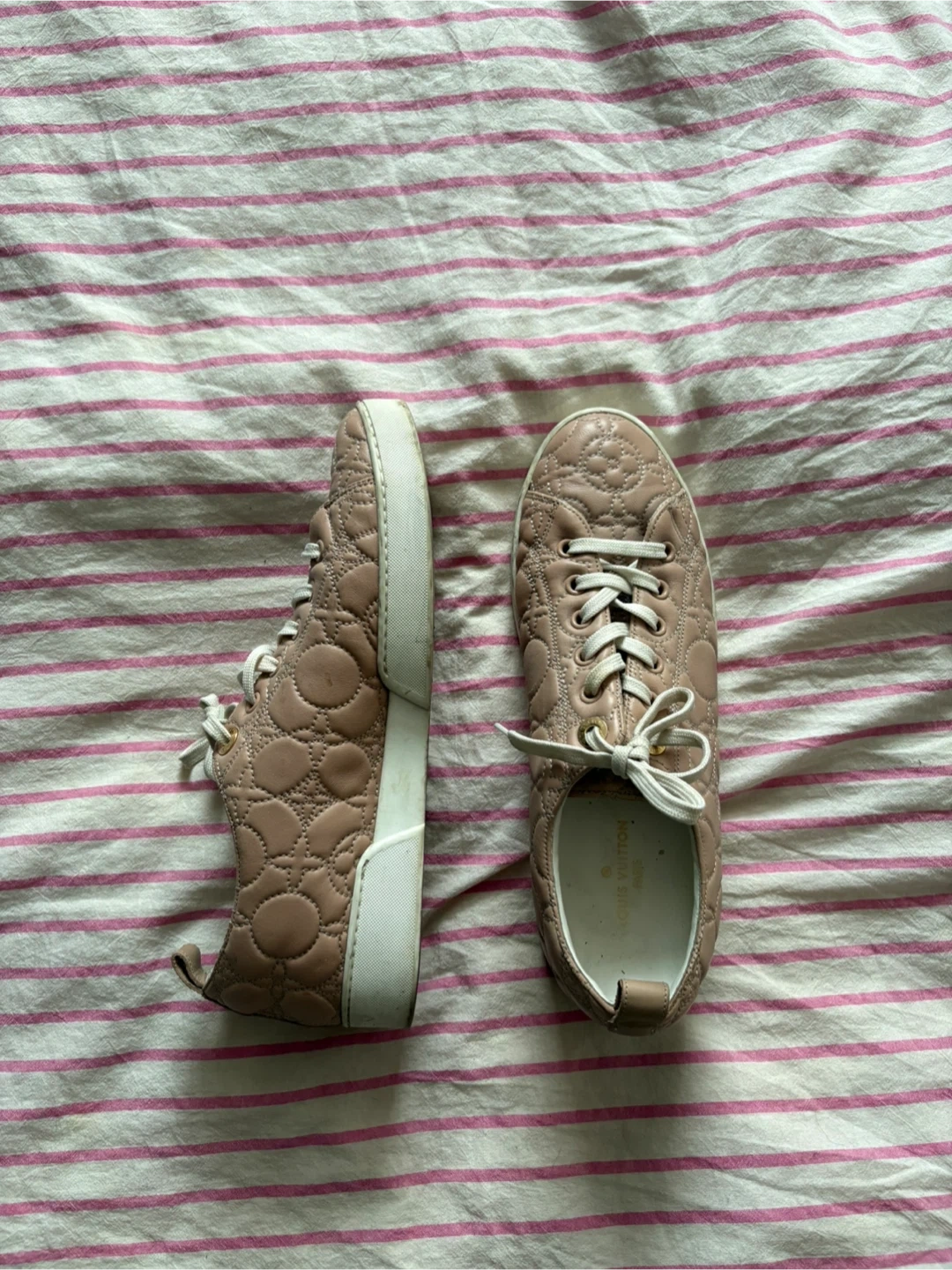 Louis Vuitton quilted leather sneakers. Classic lace-up style. Comfortable and stylish for everyday wear.