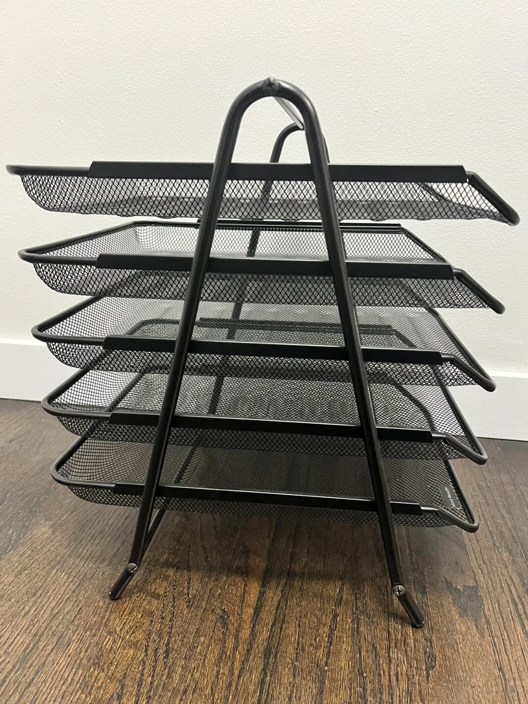 This black metal mesh desk organizer has five tiers for sorting papers and files. It's made of mesh metal. This tray is great for keeping your workspace tidy.