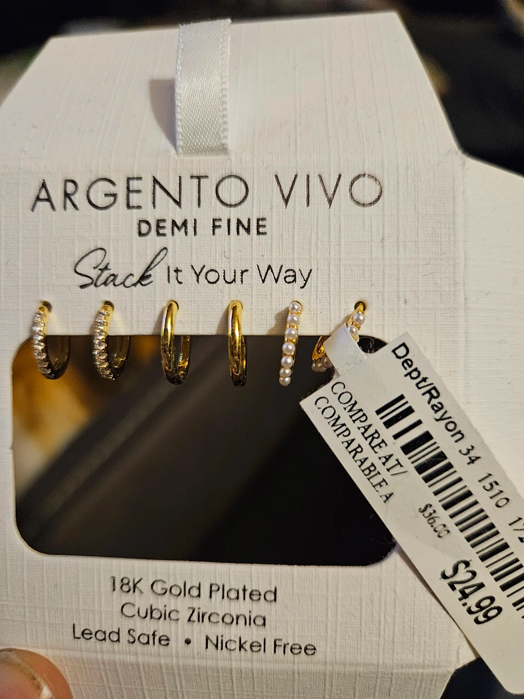 This set includes multiple pairs of demi-fine earrings. They are 18K gold plated and feature cubic zirconia and pearl details. The earrings are lead and nickel free.