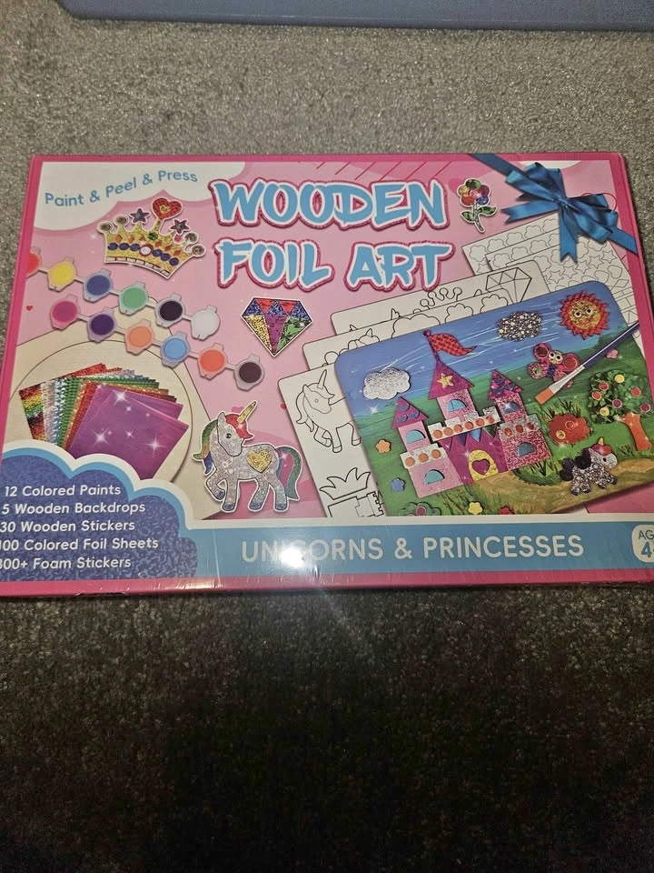 Brand new wooden foil art crafts kit for kids, featuring Unicorns & Princesses. This is a DIY wood painting kit, a creative art & craft activity. Great for ages 5-12. It's an excellent option for gifting and is still in its original package. Comes from a pet-free and smoke-free home.