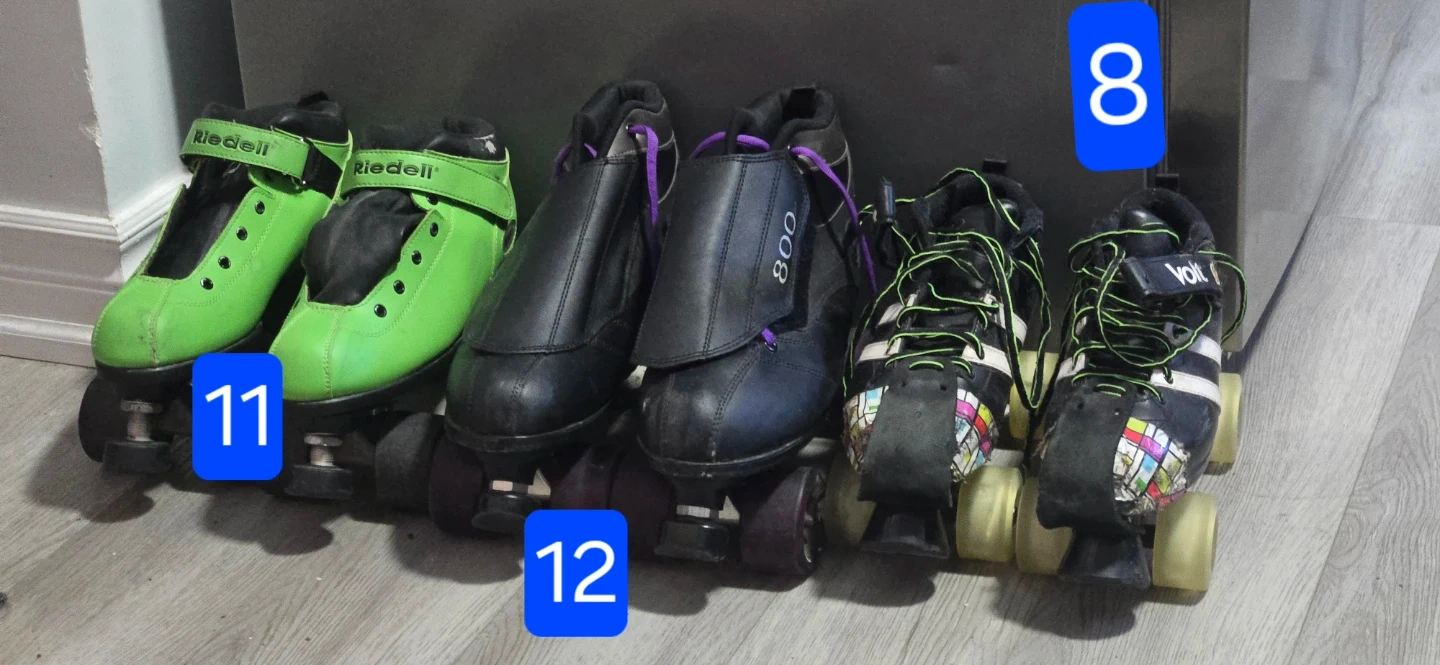 A pair of green Riedell roller skates and a pair of black Volt roller skates. They're great for all types of skating. Material appears to be leather and synthetic.Price is for all 3 pairs but am willing to negotiate a price for any pair.sizes are in the photo