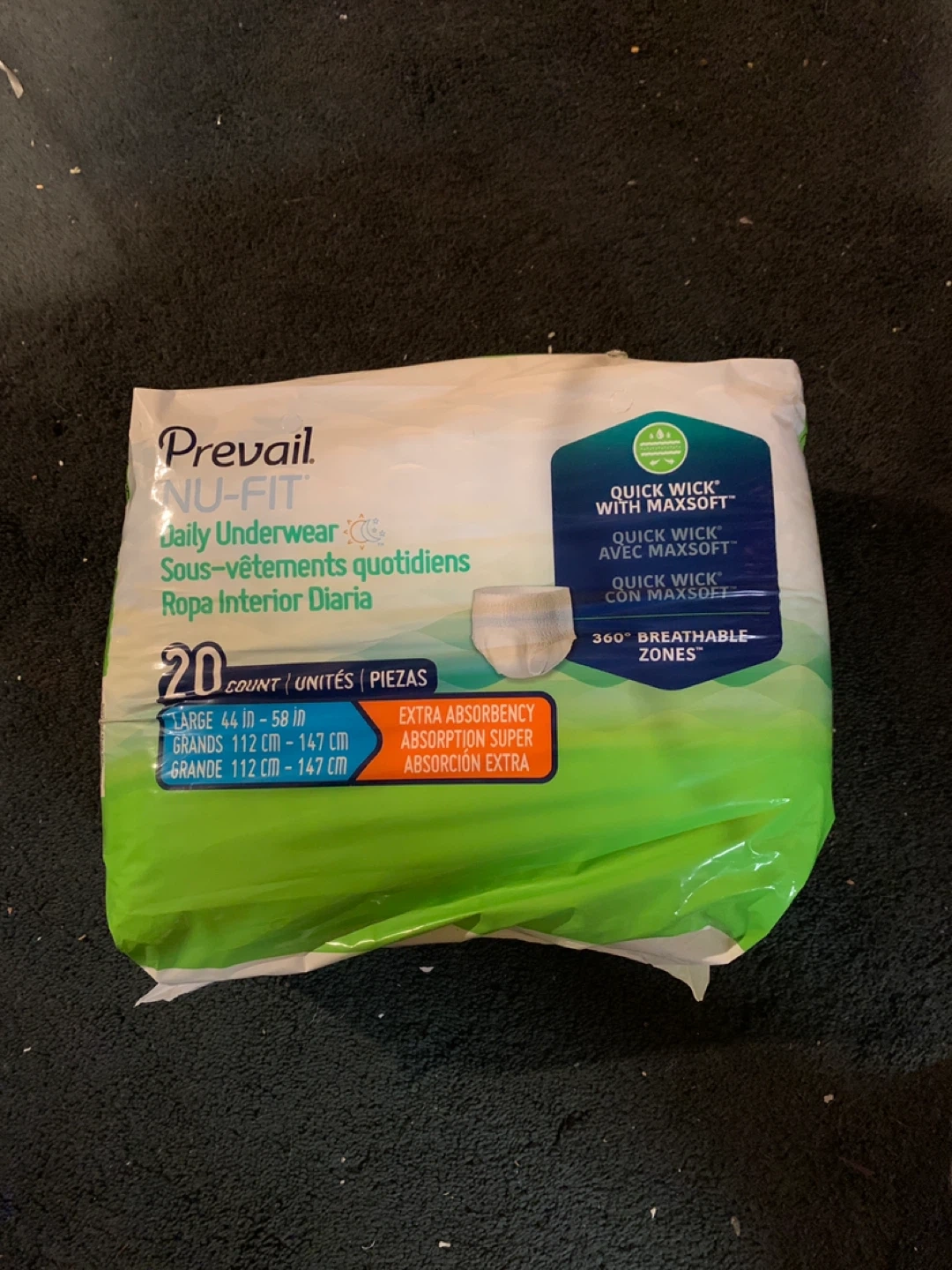 Prevail Nu-Fit Daily Underwear. Features quick wick with MaxSoft technology and 360° breathable zones. Large size fits 44-58 inches (112-147 cm). 20 count package with extra absorbency I have 3 pages (NEW)all for a low price