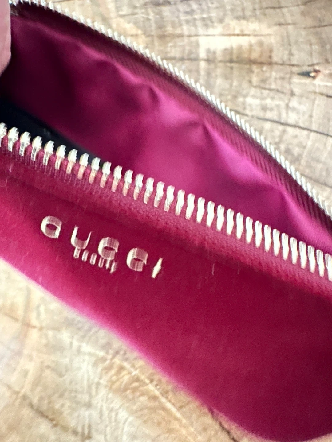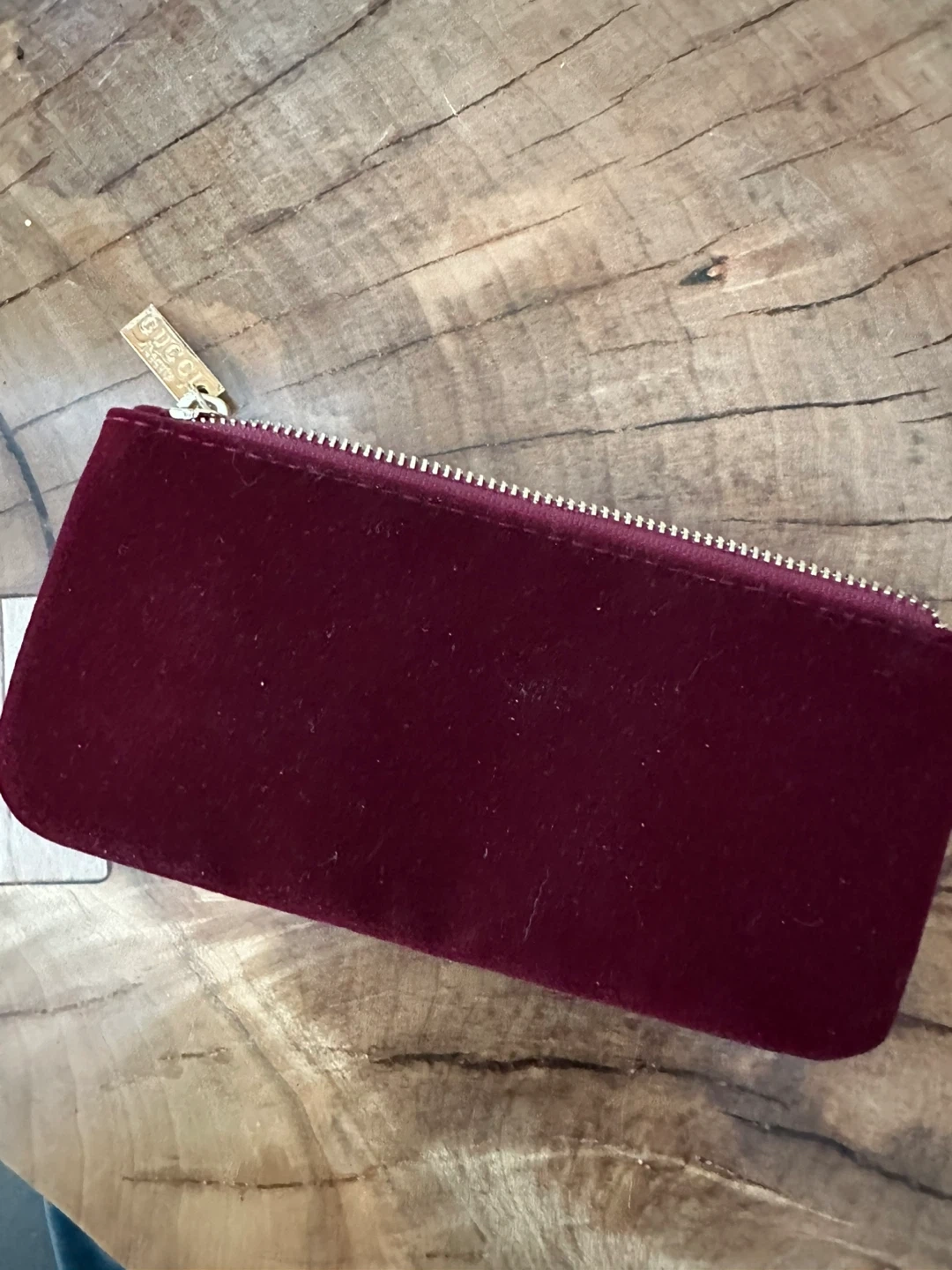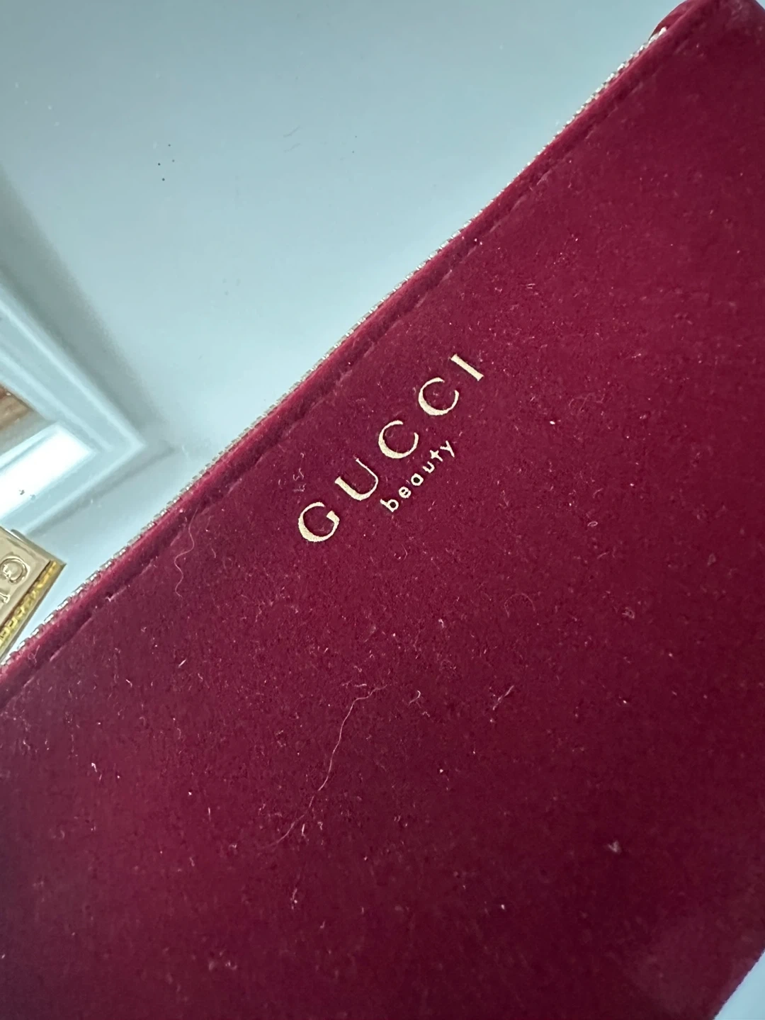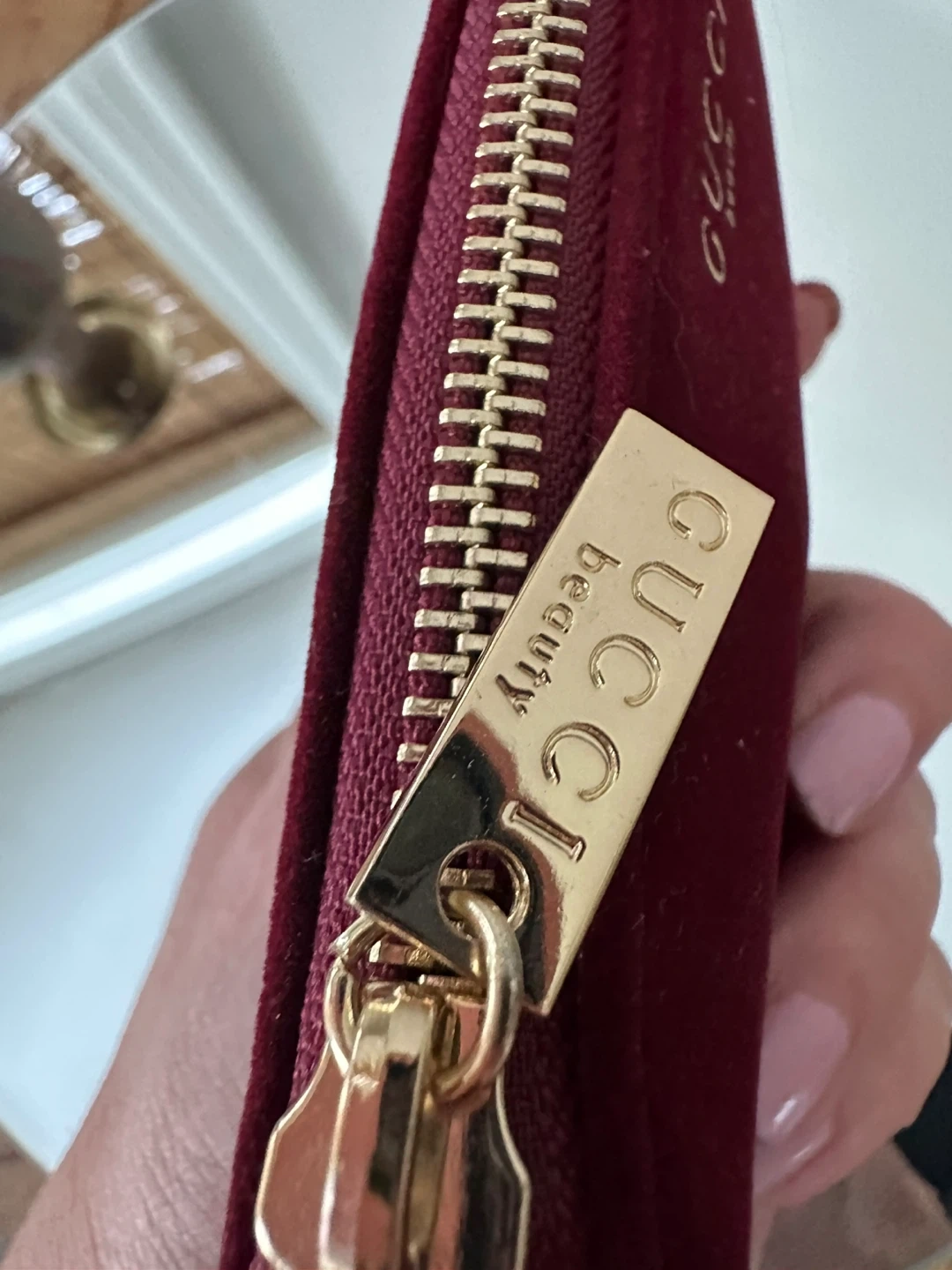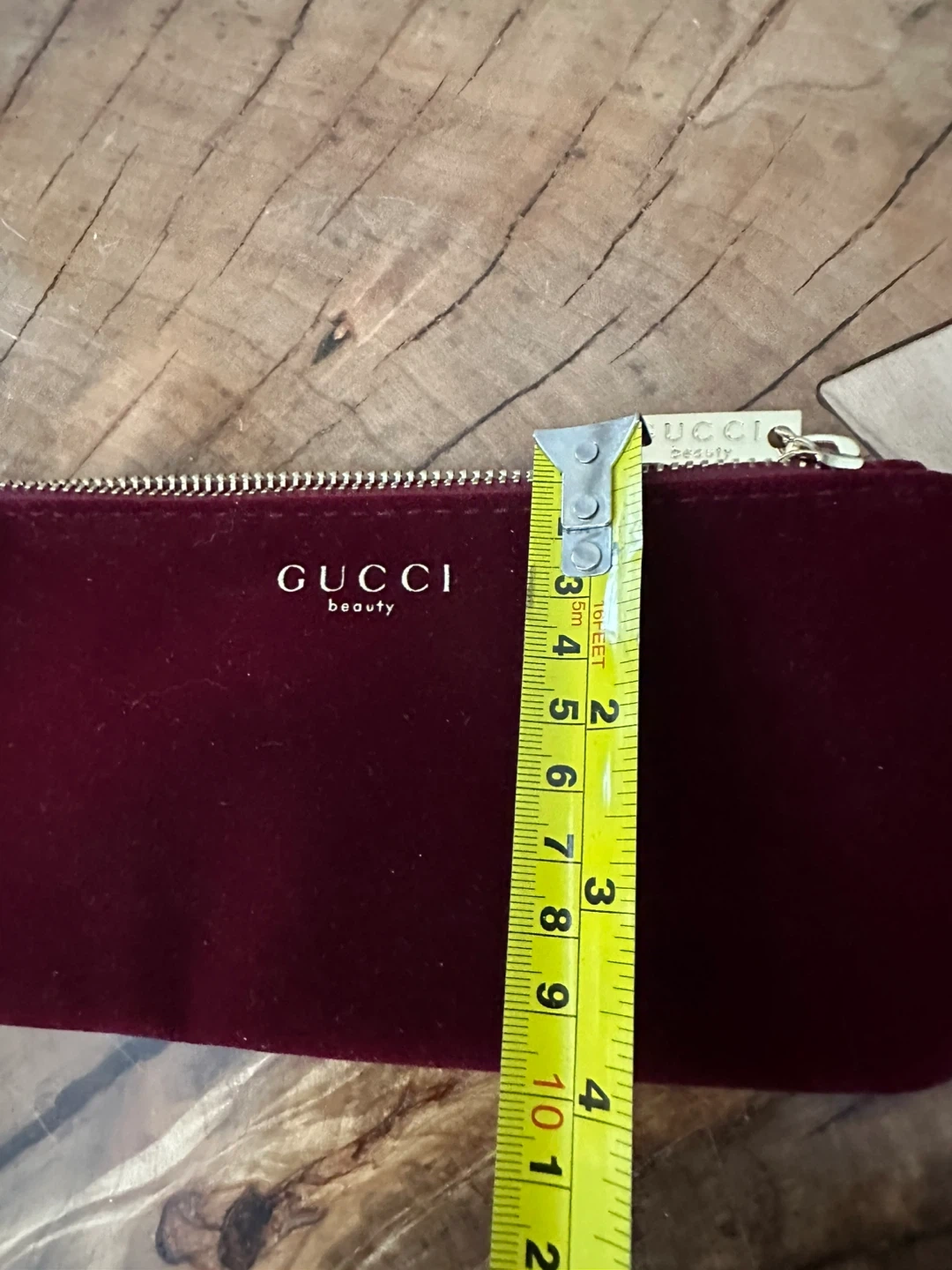 This is a burgundy velvet pouch from Gucci Beauty. It's perfect for storing makeup or small essentials. It measures approximately 8 inches long and 4 inches tall.