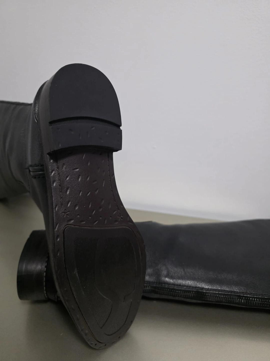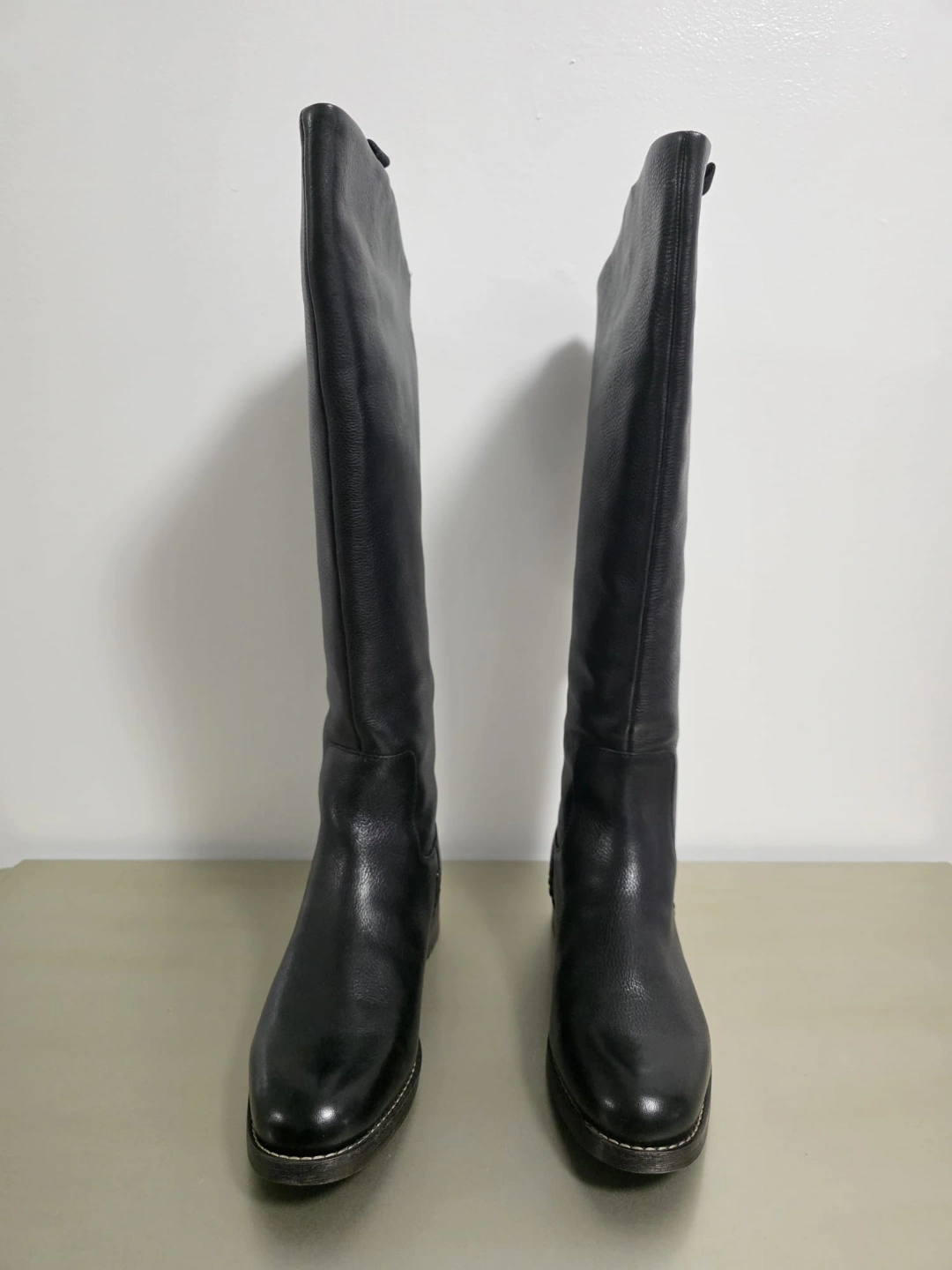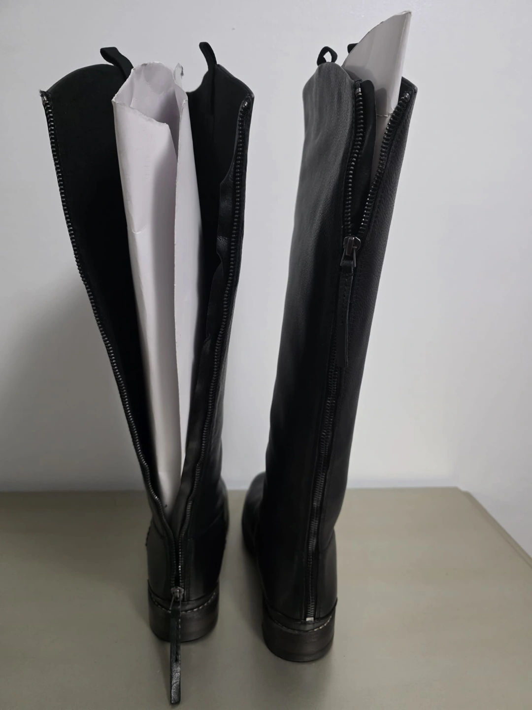 Women's black leather knee-high boots. back zip closure. Low block heel. New booths never worn....only the box is signs of distressed