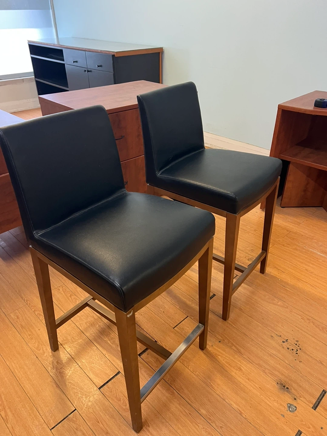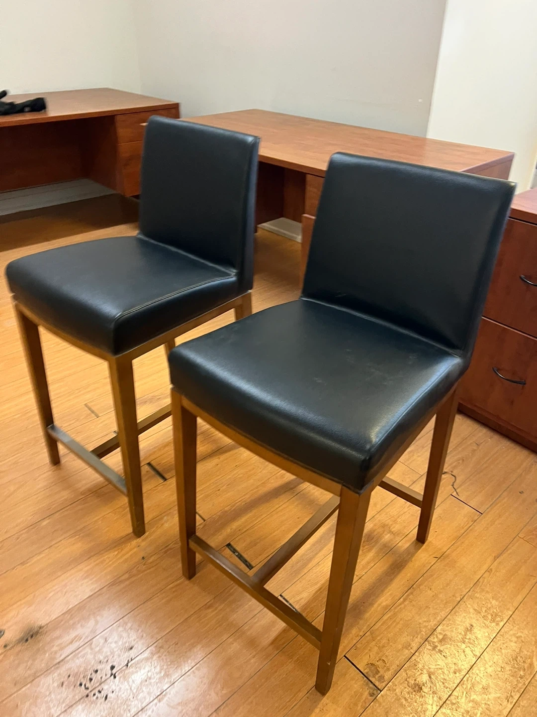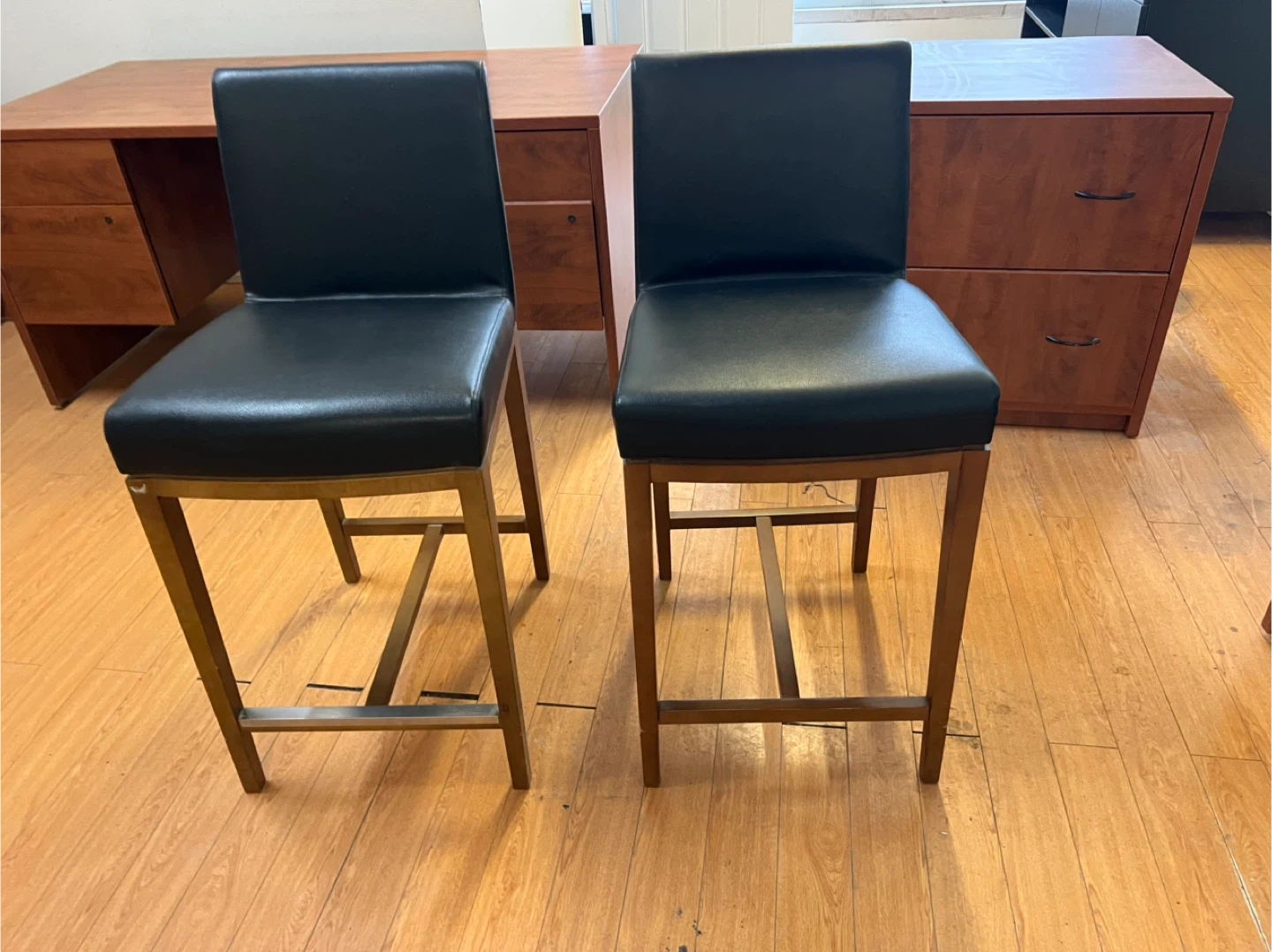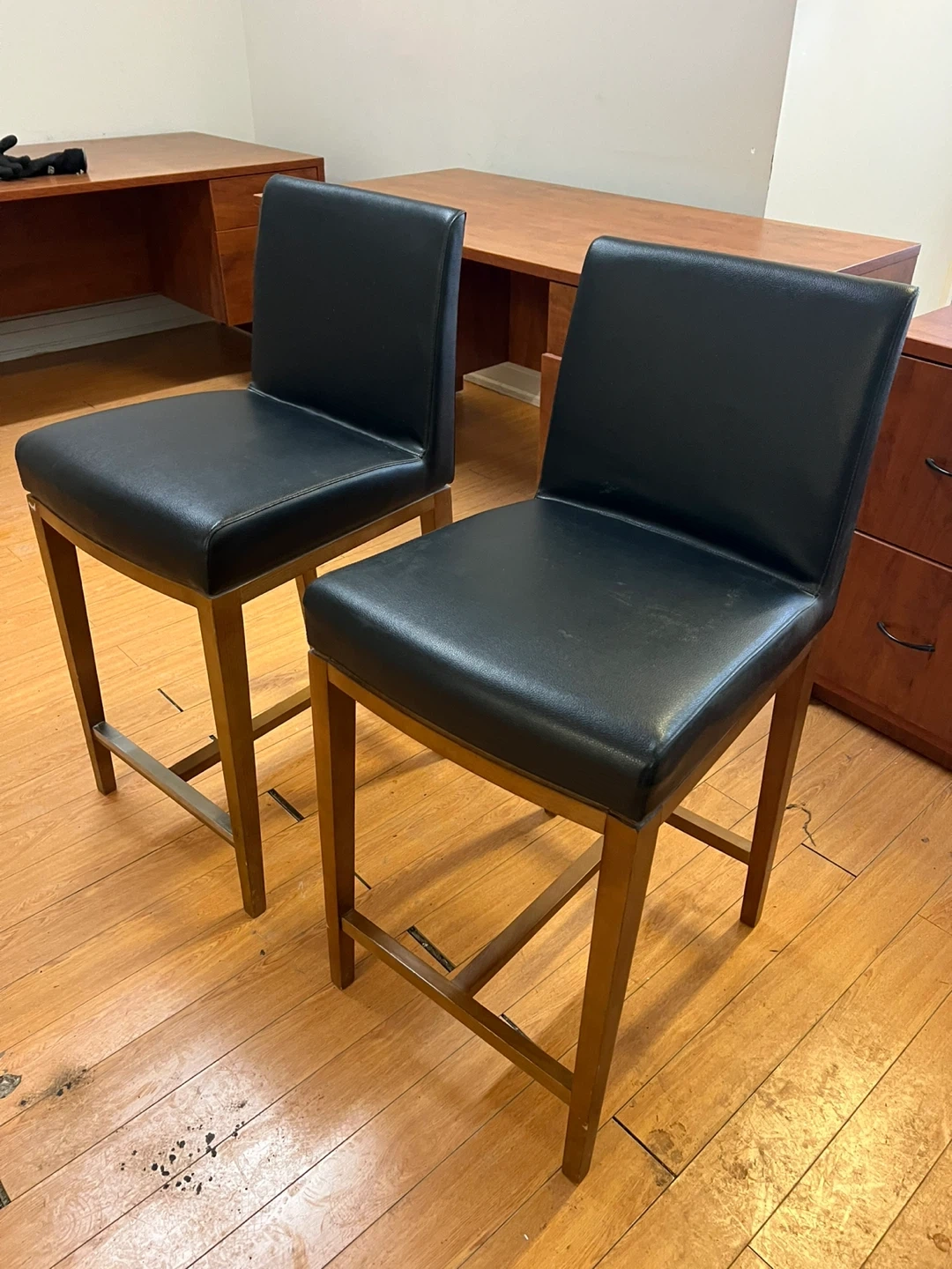 Selling a used pair of black bar stools with faux leather upholstery. They feature wooden legs and a metal footrest. Great for a kitchen island or home bar!