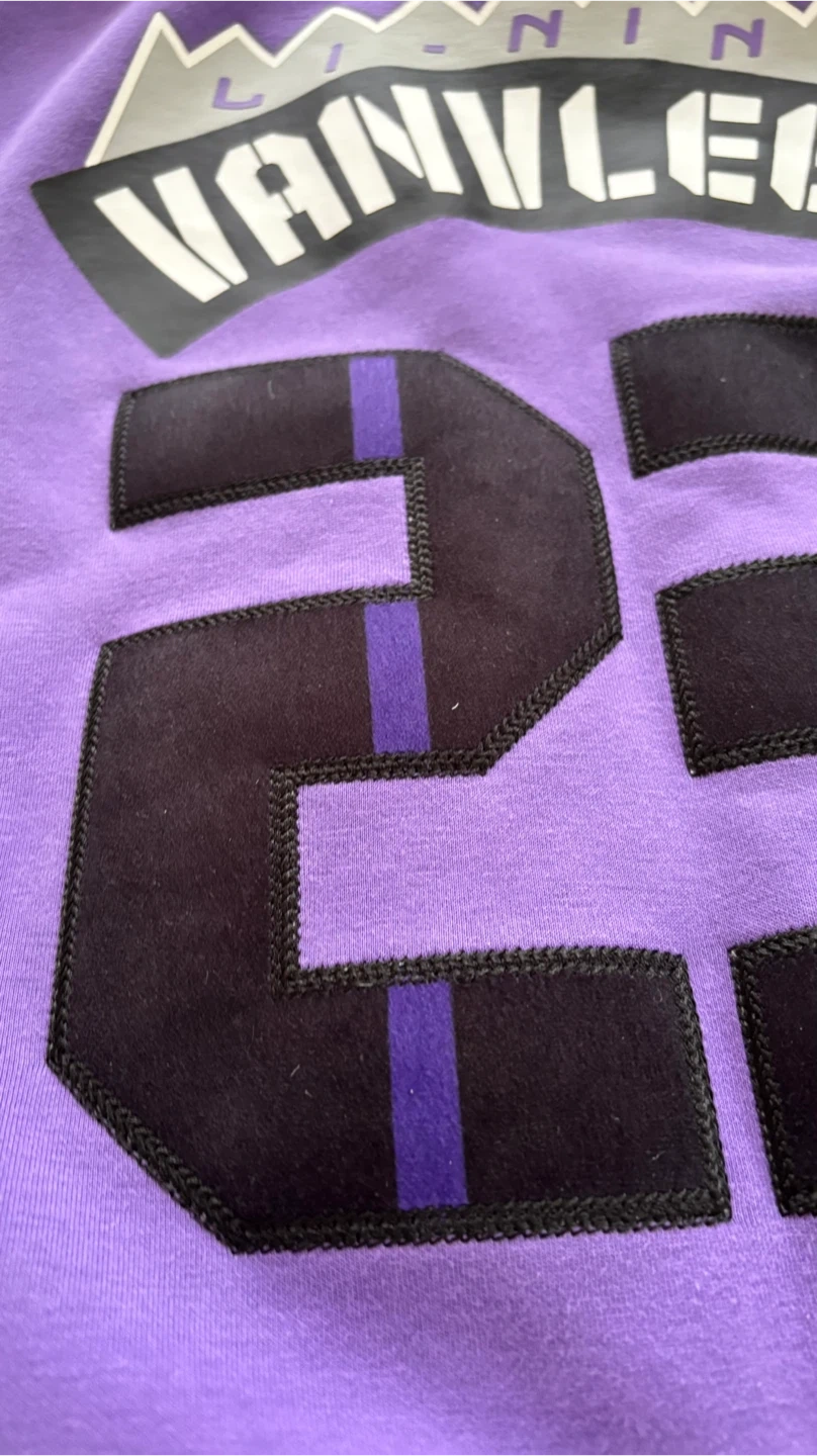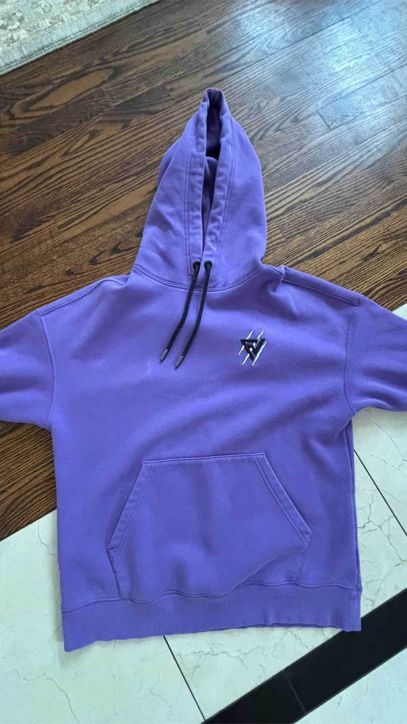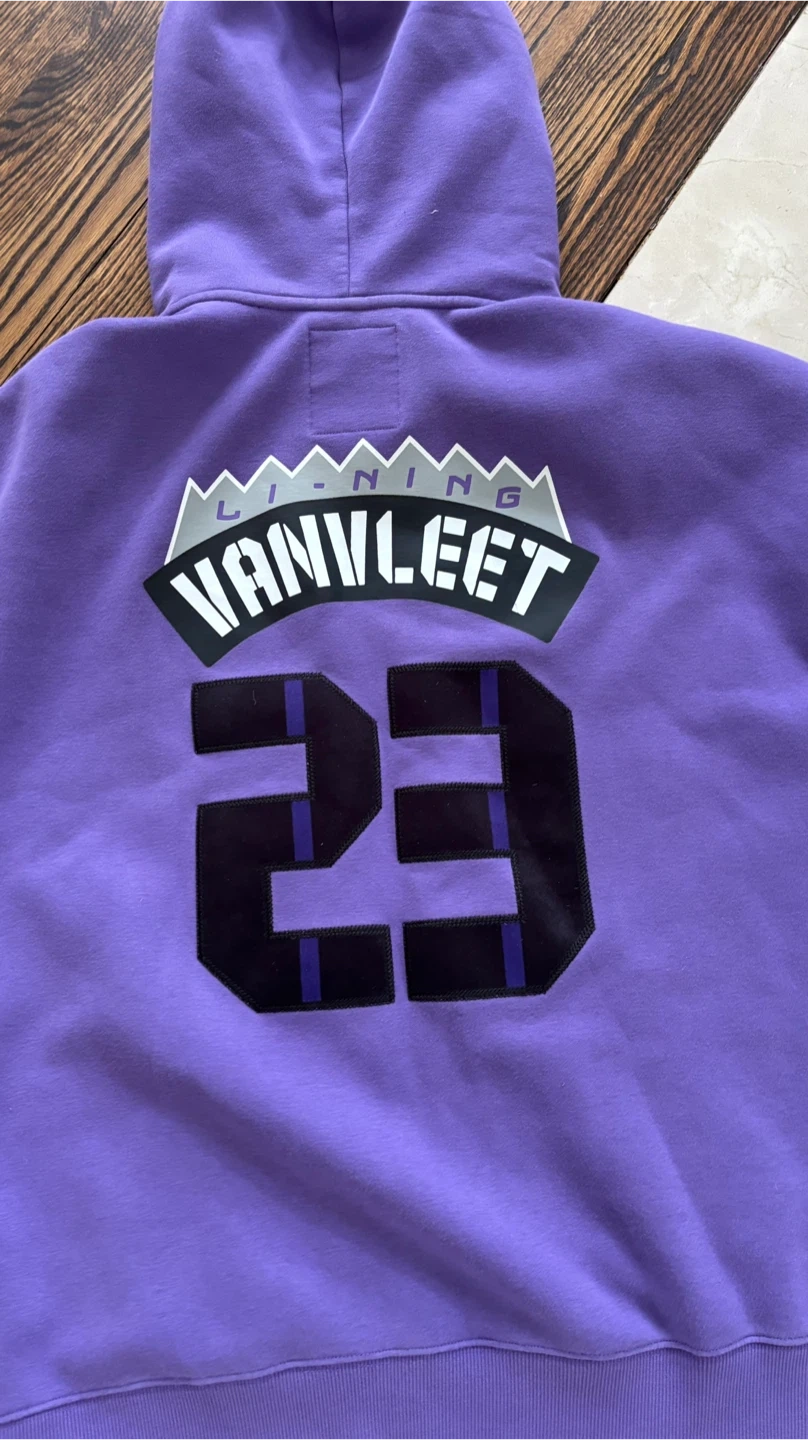 This is a Li-Ning VANILEET hoodie in purple. It features embroidered graphics on the front and a large "23" graphic on the back. The hood has black drawstrings with metal tips. Made from a soft fabric for comfort.