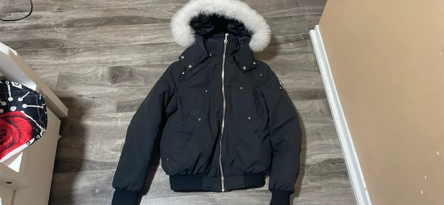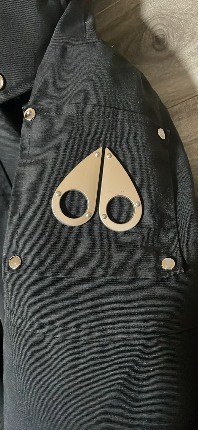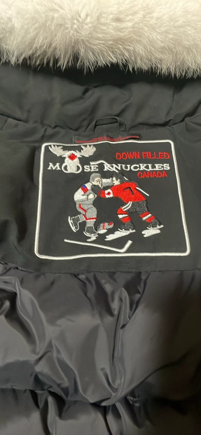 Moose Knuckles jacket in black. Size S White far lined hood and hockey pick up ajax