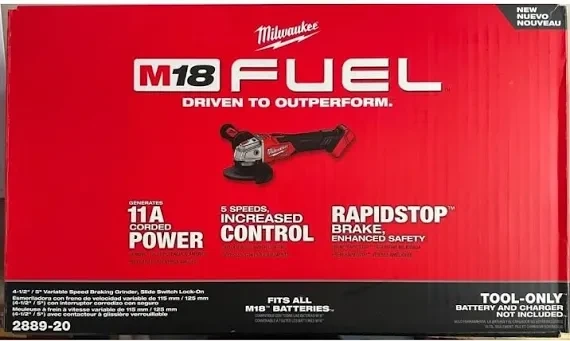 Milwaukee M18 FUEL variable speed braking grinder. It generates 11A corded power with 5 speeds for increased control. Features Rapidstop brake for enhanced safety. Tool-only, battery and charger not included.