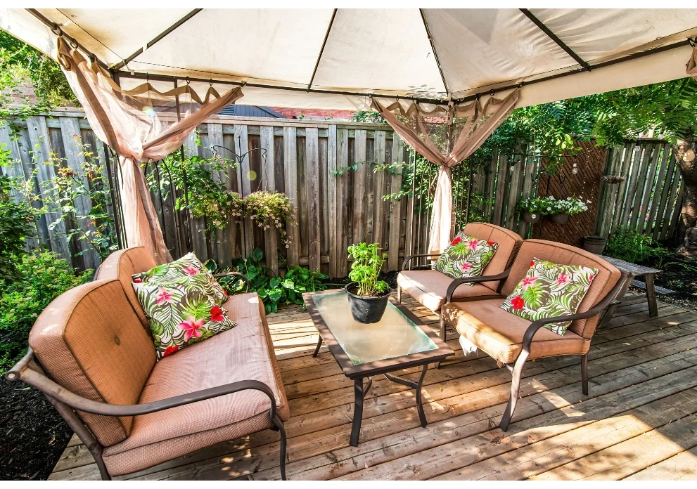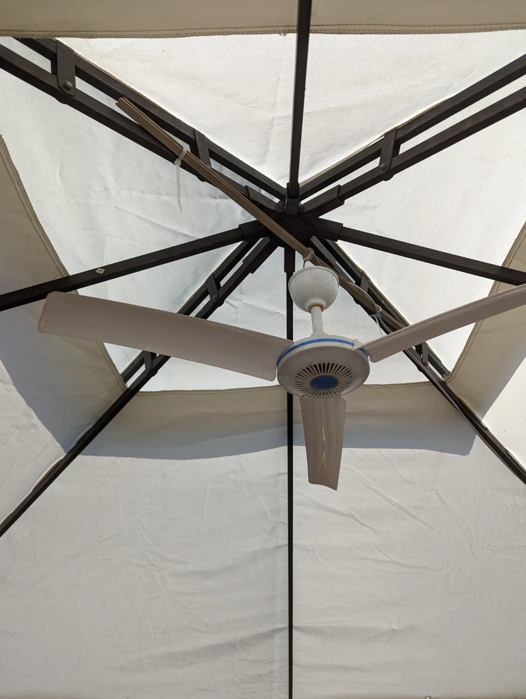 10x10 Gazebo with mosquito curtains. It provides ample shade for outdoor seating areas. This gazebo is perfect for summer gatherings on your deck or patio. I am also including a free Fan to keep you cool in the summer!