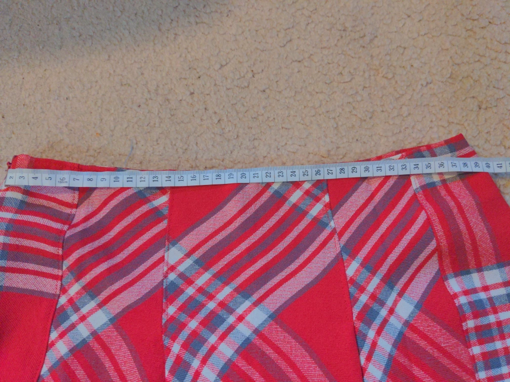 Women's mini skirt. Red, white, and grey plaid pattern. Pleated design. Fully lined. Made from wool.
