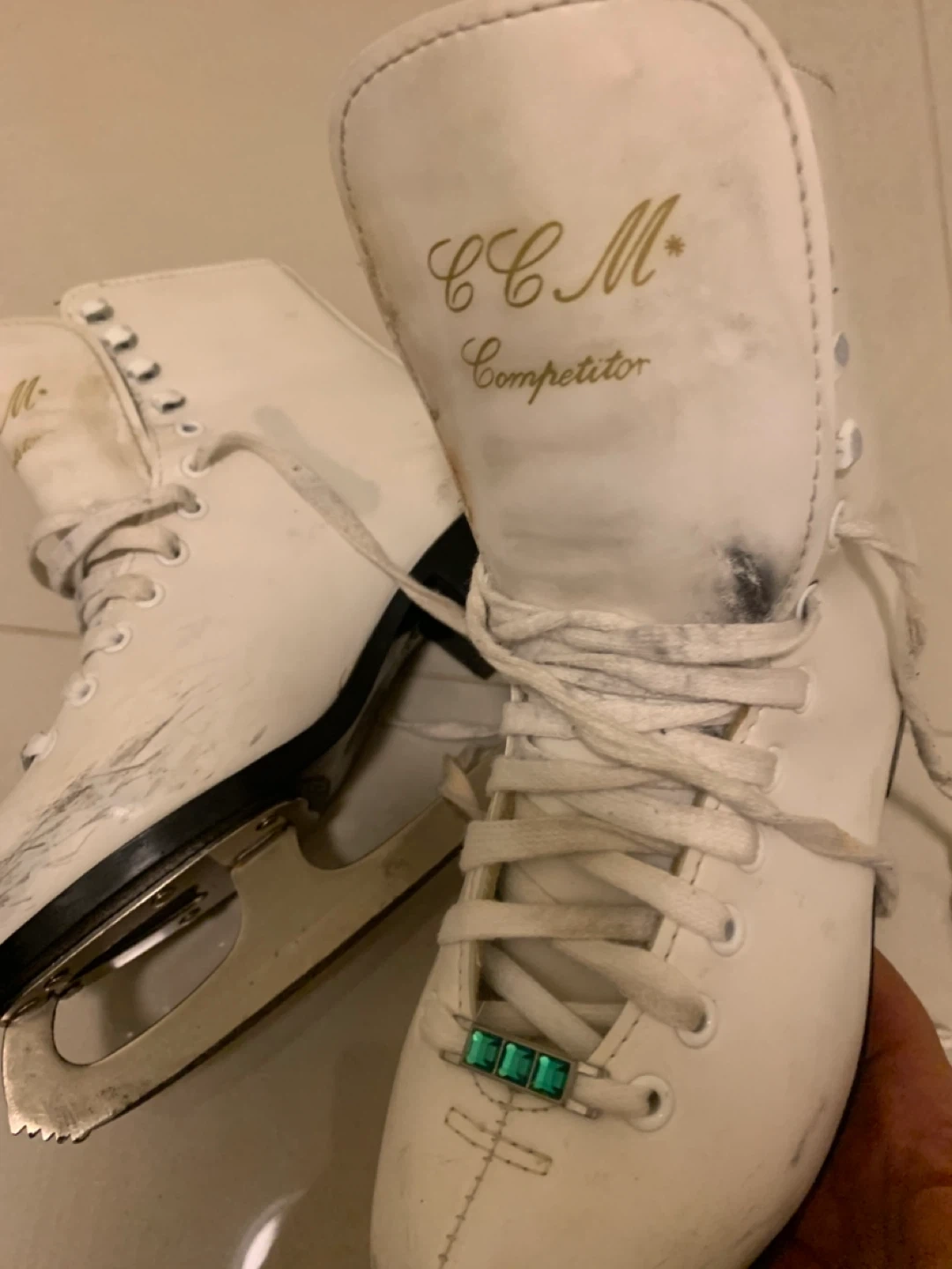 White CCM Competitor figure skates. Comes with blade guards. Some scuffs and marks consistent with use. Size 4 women's.