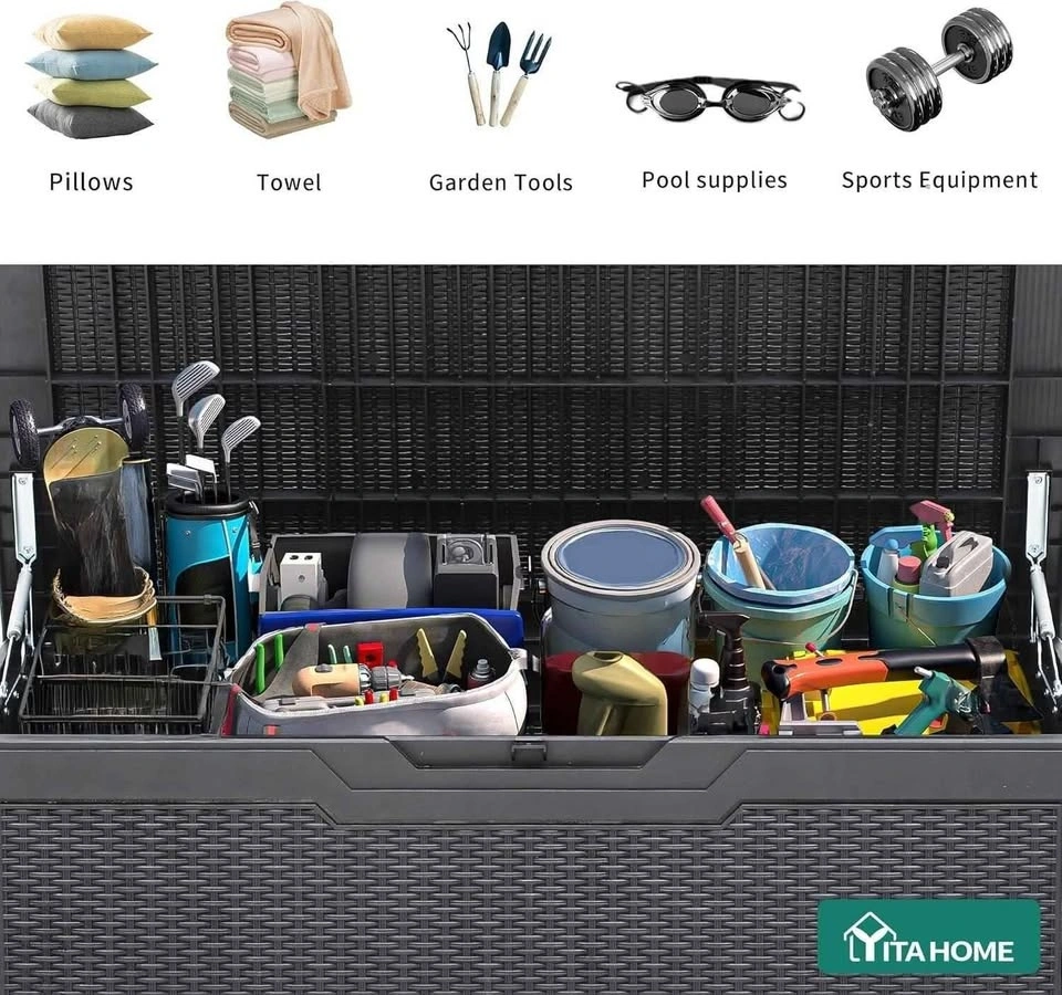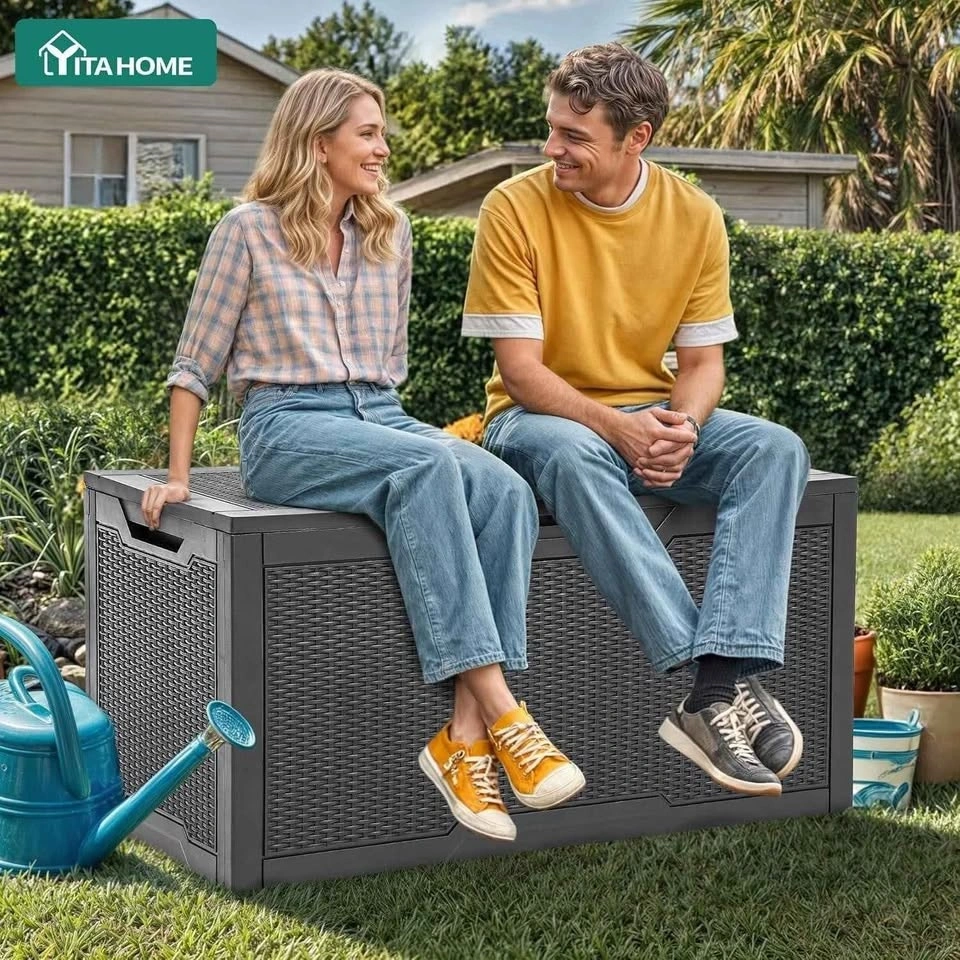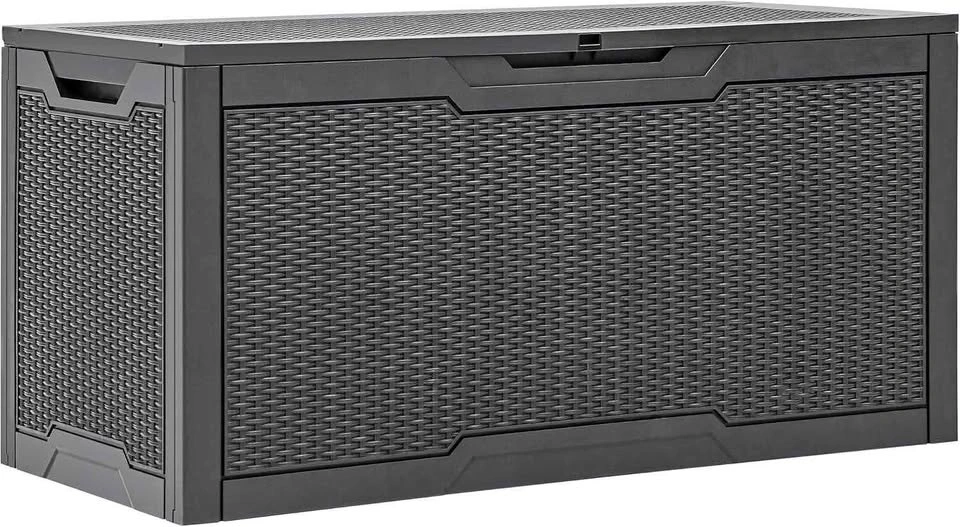 Spacious YITA HOME 100 gallon outdoor storage box. Dark grey with a cool wicker texture. Great for keeping your patio cushions, garden tools, or pool stuff dry and organized. Also strong enough to use as a bench! Measures 45.4" long, 21.7" wide, and 23" high. Holds up to 485 pounds.