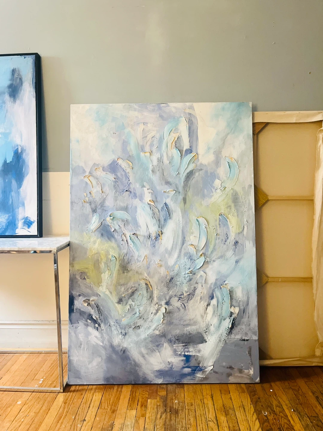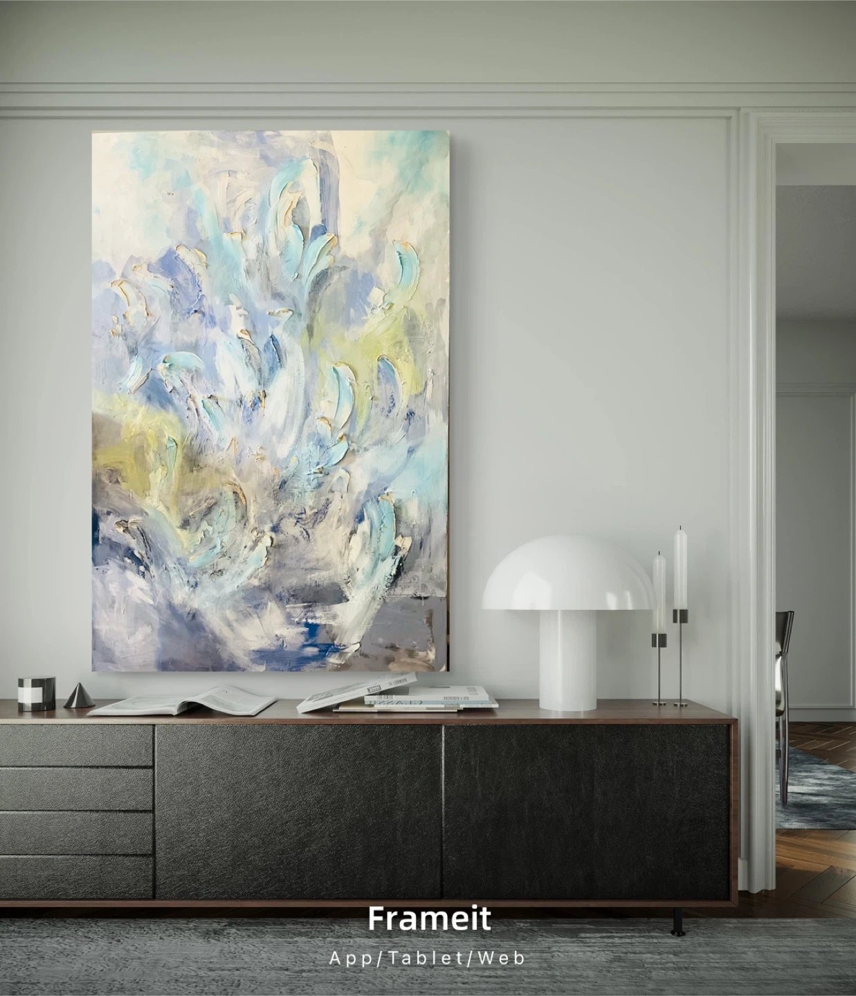 Beautiful abstract painting with textured brushstrokes in soothing blues, whites, and yellow hues. It's a statement piece for any living space. Canvas art. This is a real painting on canvas, signed on the back.