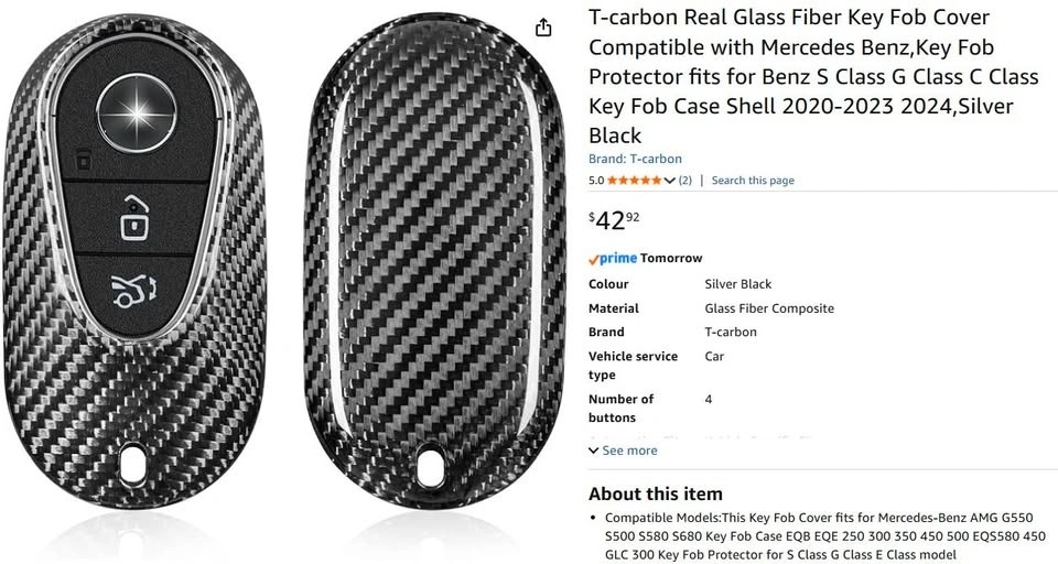 Hi there! I have a brand new in box Mercedes-Benz key fob cover available. It's made of a carbon fiber-style glass composite and is designed for 4-button smart keys. This cover fits many models, including S-Class, G-Class, E-Class, EQ series, and GLC. It provides a precise fit, allows full button access, and won't block the signal or the logo. It's also lightweight and scratch-resistant, adding both protection and a premium look to your key.