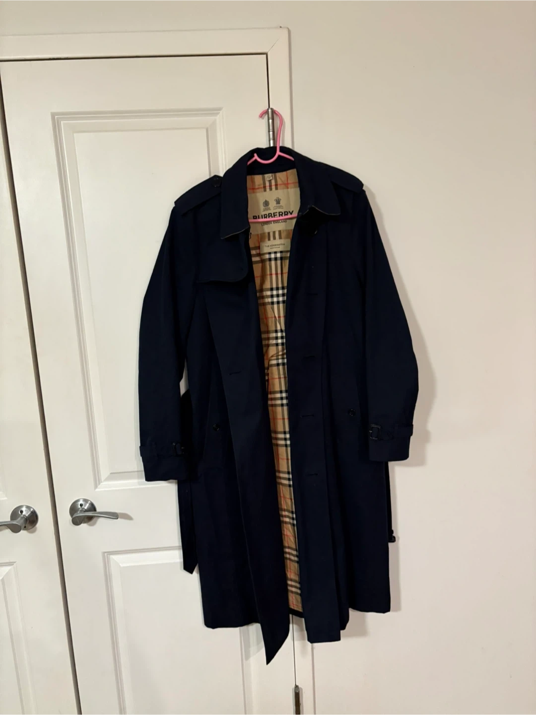 Selling a Burberry London England trench coat in great condition! The coat is navy blue with the classic Burberry plaid lining. It's a timeless piece that will keep you stylish and warm