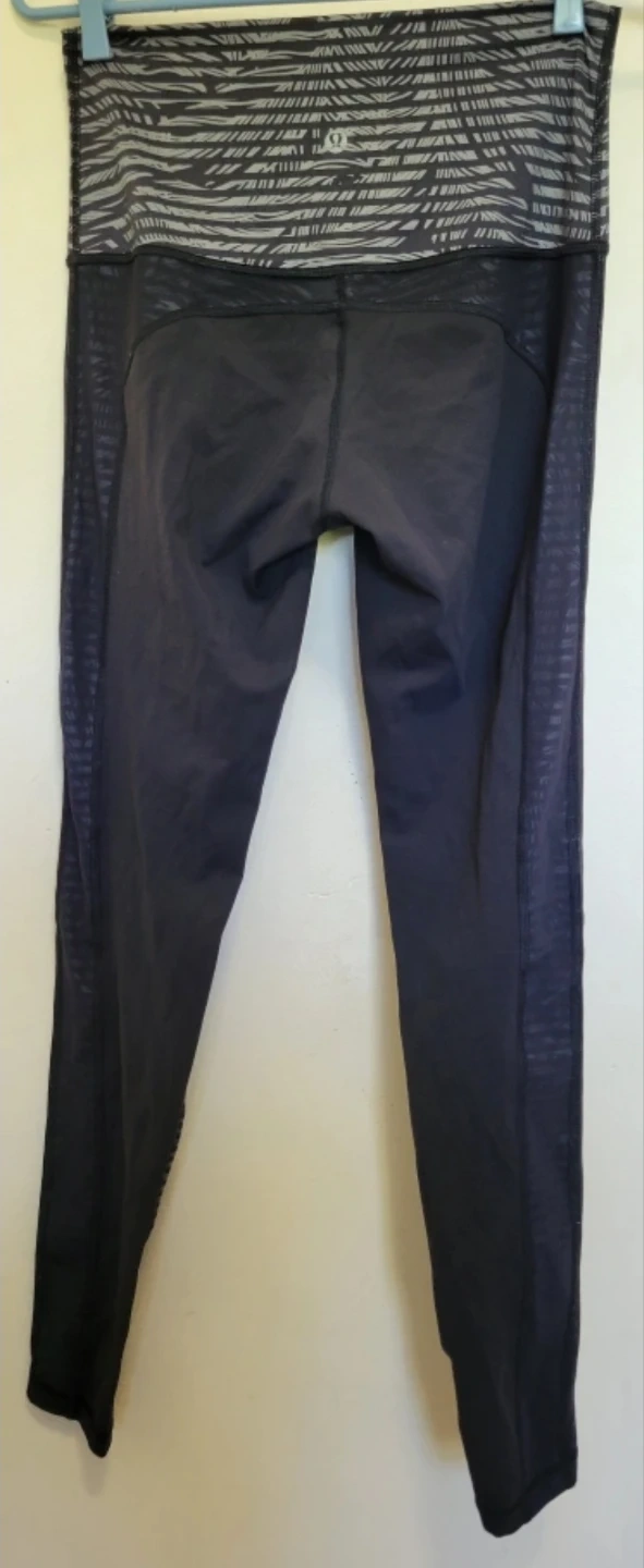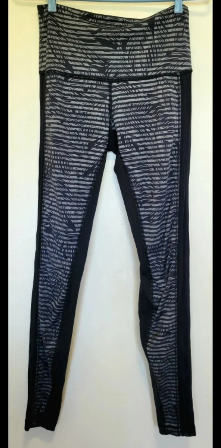 These Lululemon leggings are great for workouts or everyday wear. They feature a black and grey patterned waistband and side panels with sheer mesh accents. It's a comfortable and stylish addition to your active wardrobe!