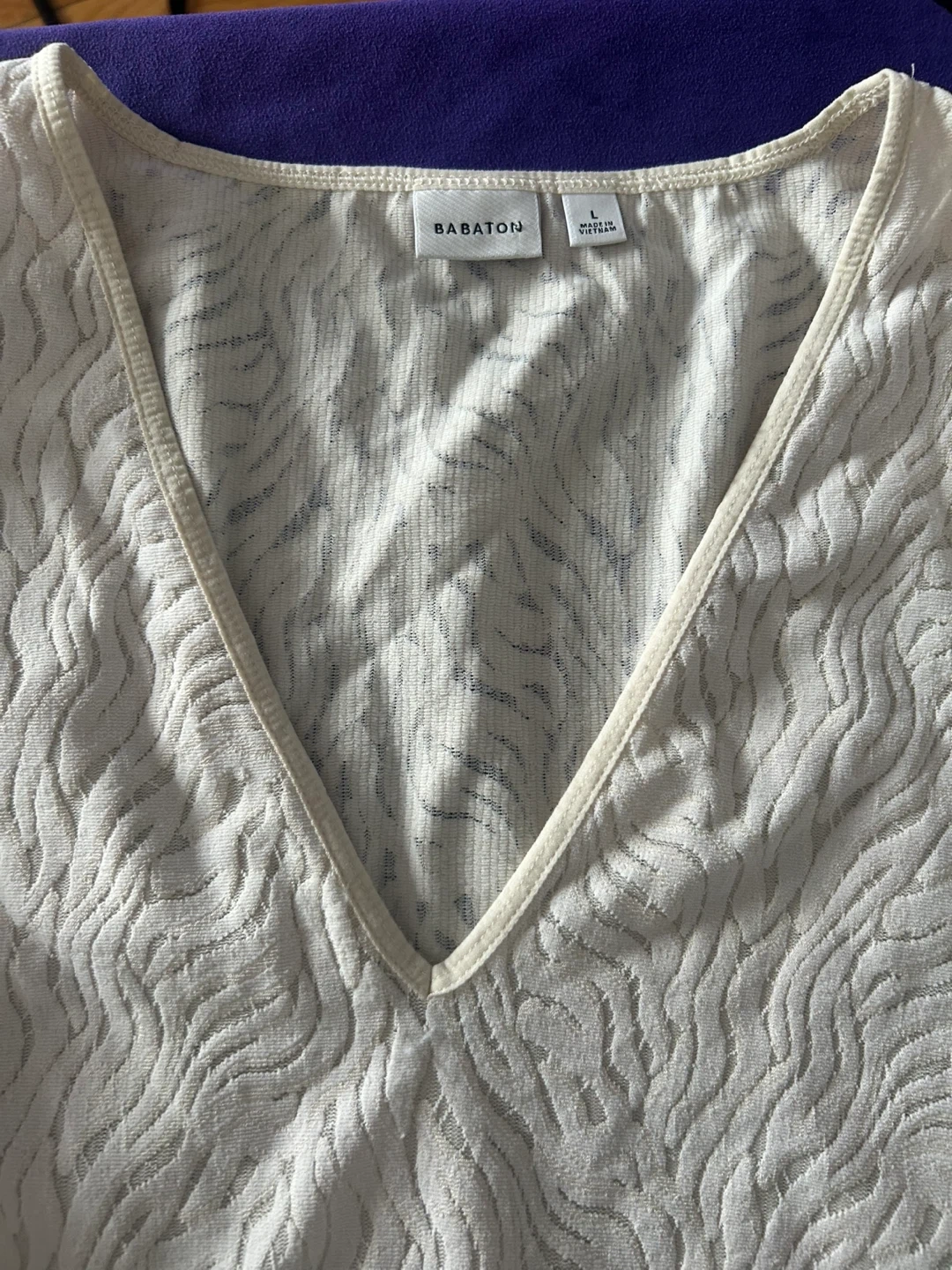 A cream-coloured Babaton bodysuit with a subtle wave-like textured pattern. It features a V-neck and a snap closure at the crotch. Made in Canada, size large.