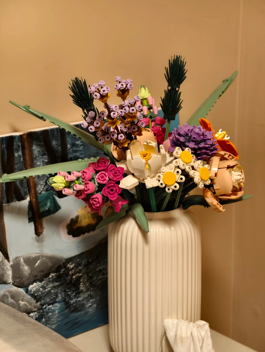 This LEGO set features a vibrant bouquet of buildable flowers, including roses, daisies, poppies, and lavender. It comes with all the bricks needed to construct a stunning floral arrangement. These pieces are plastic.