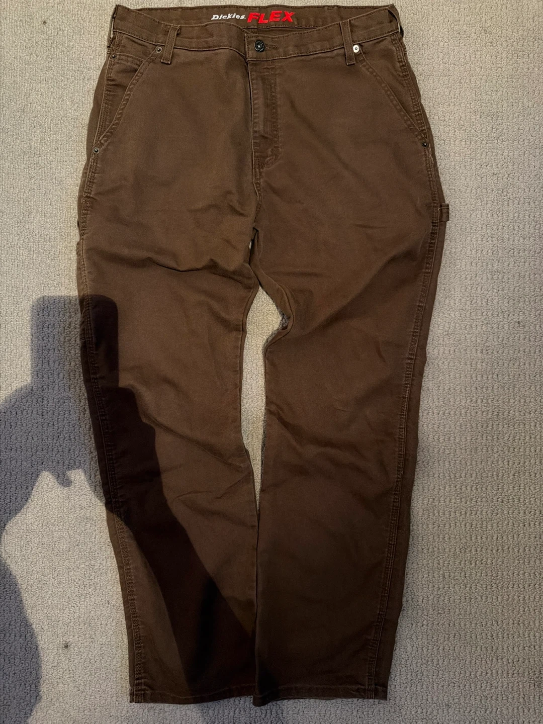 Dickies FLEX work pants in a relaxed fit. These brown carpenter pants are made with durable fabric. They feature a straight leg and utility pockets. Bought from Boathouse couple of years ago