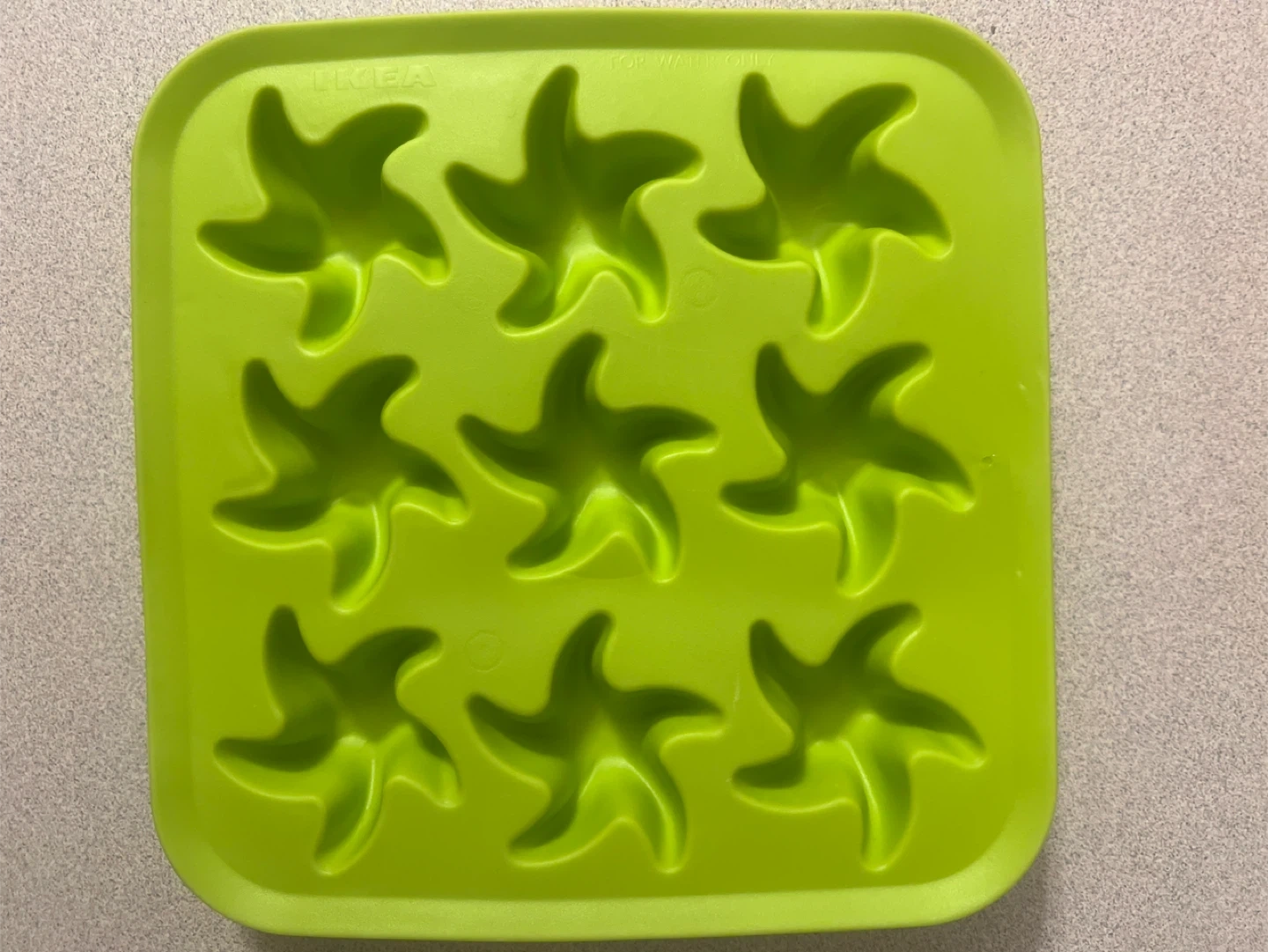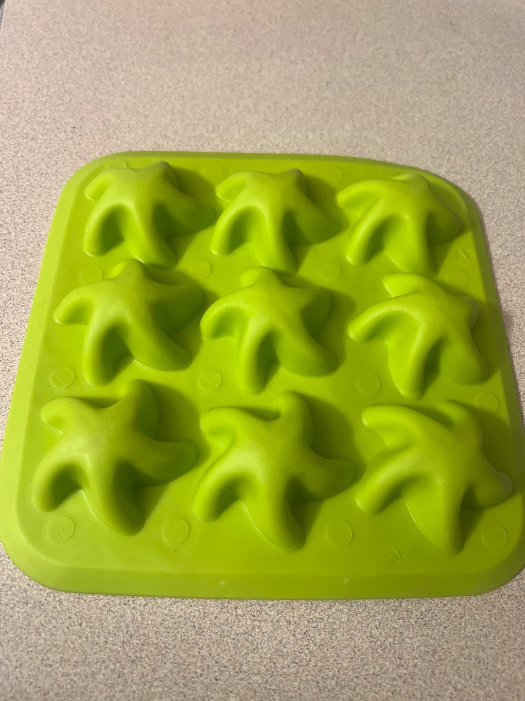This is an IKEA silicone ice cube tray shaped like starfish. It makes nine ice cubes. It's made from flexible silicone material. Mint condition.