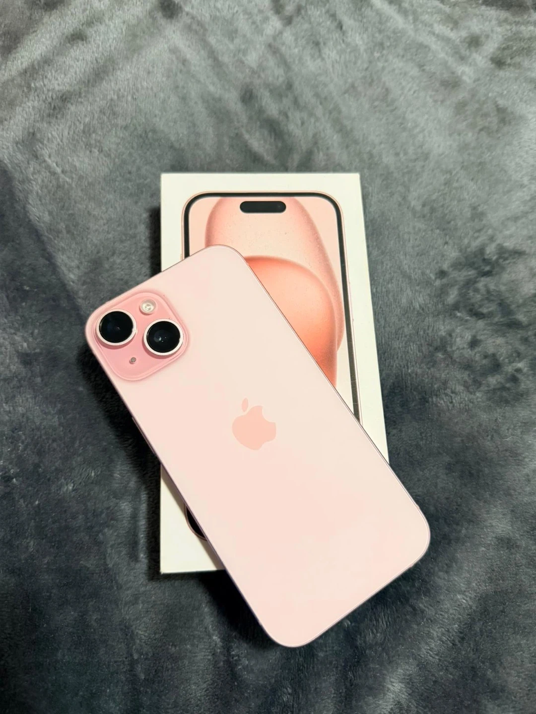 iPhone 15 in pink. Battery health is at 86% with a cycle count of 707. Manufactured in October 2023. Includes original box.