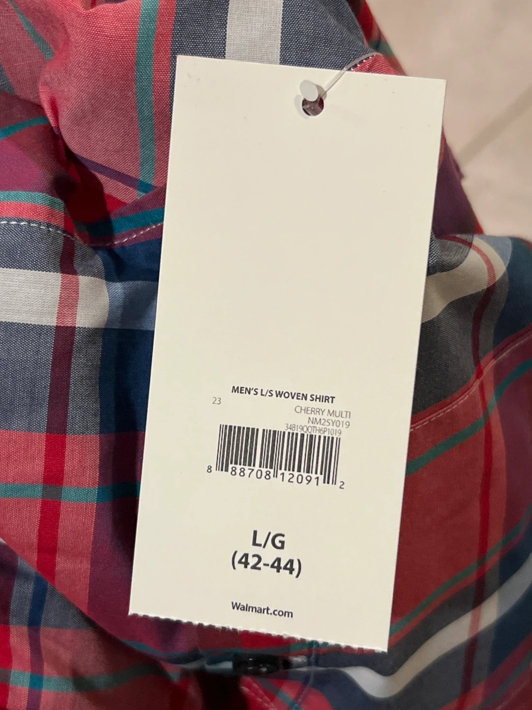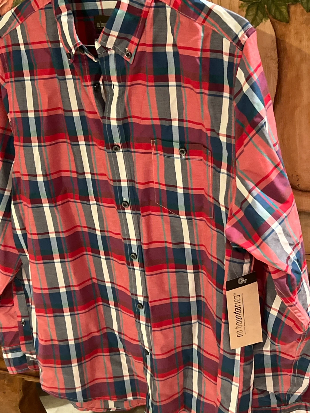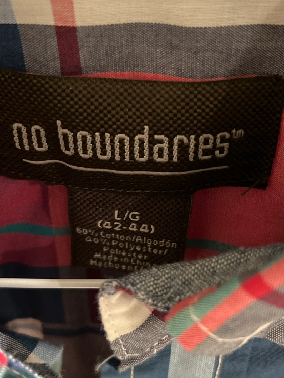 This men's long-sleeve button-down shirt from No Boundaries features a classic plaid pattern. It's made of 60% cotton and 40% polyester. The size is L/G (42-44).