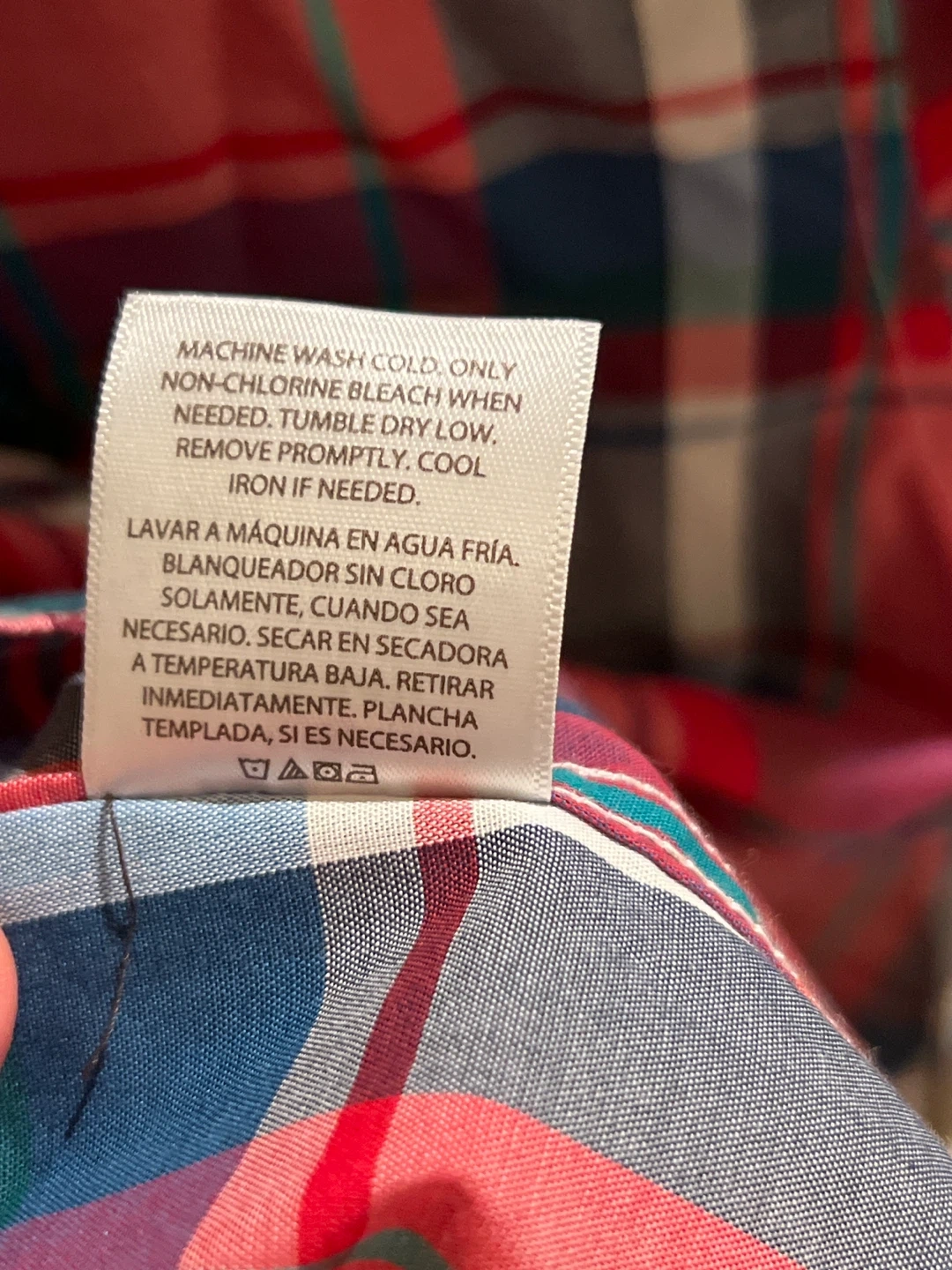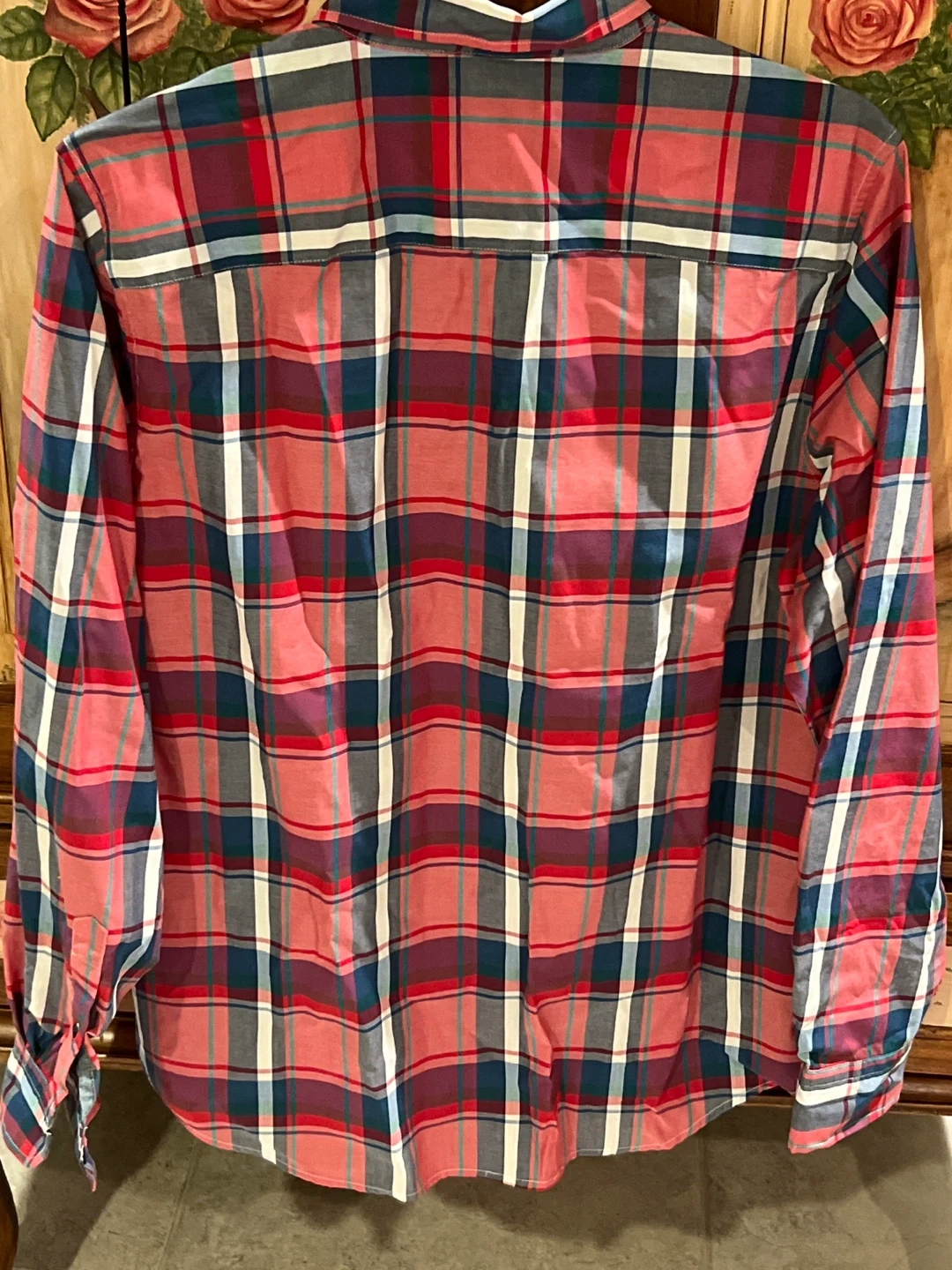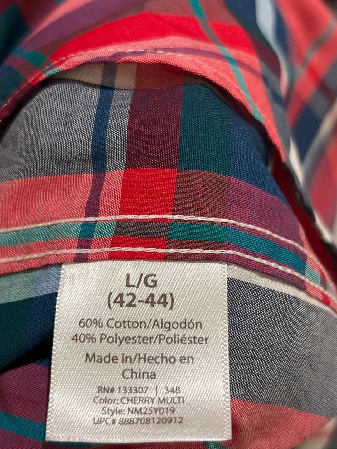 This men's long-sleeve button-down shirt from No Boundaries features a classic plaid pattern. It's made of 60% cotton and 40% polyester. The size is L/G (42-44).