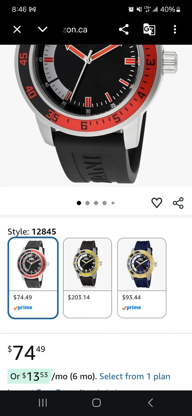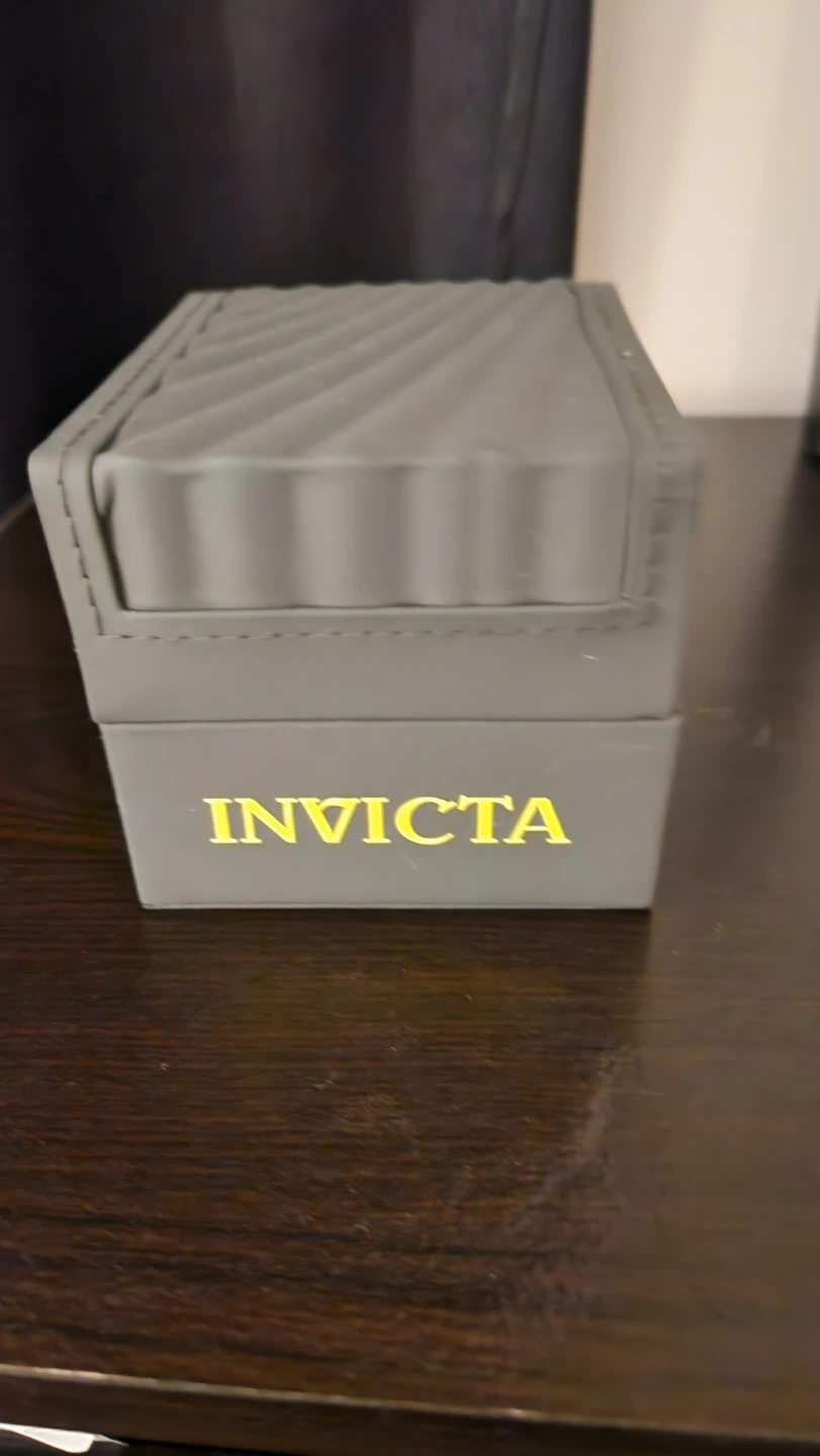 Invicta watch with a black dial and red bezel. It comes with a black rubber strap and the original box. Includes limited warranty and instruction information.