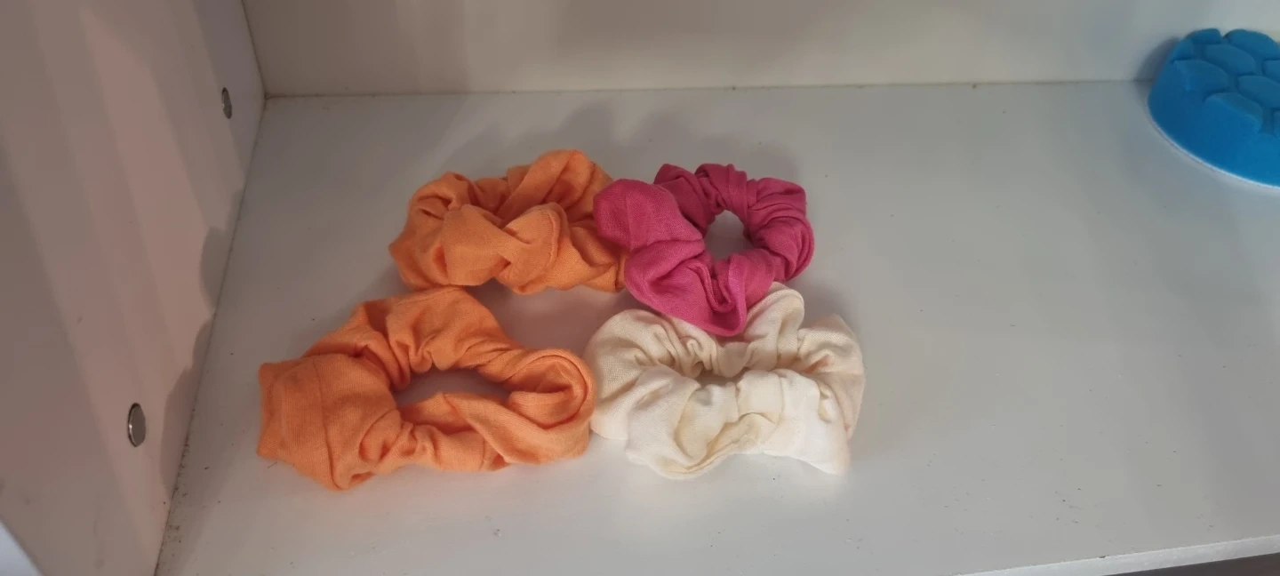 This is a set of four scrunchies in various colours: orange, pink, and cream. They're made of fabric and are perfect for holding your hair back.