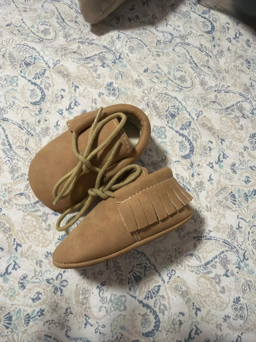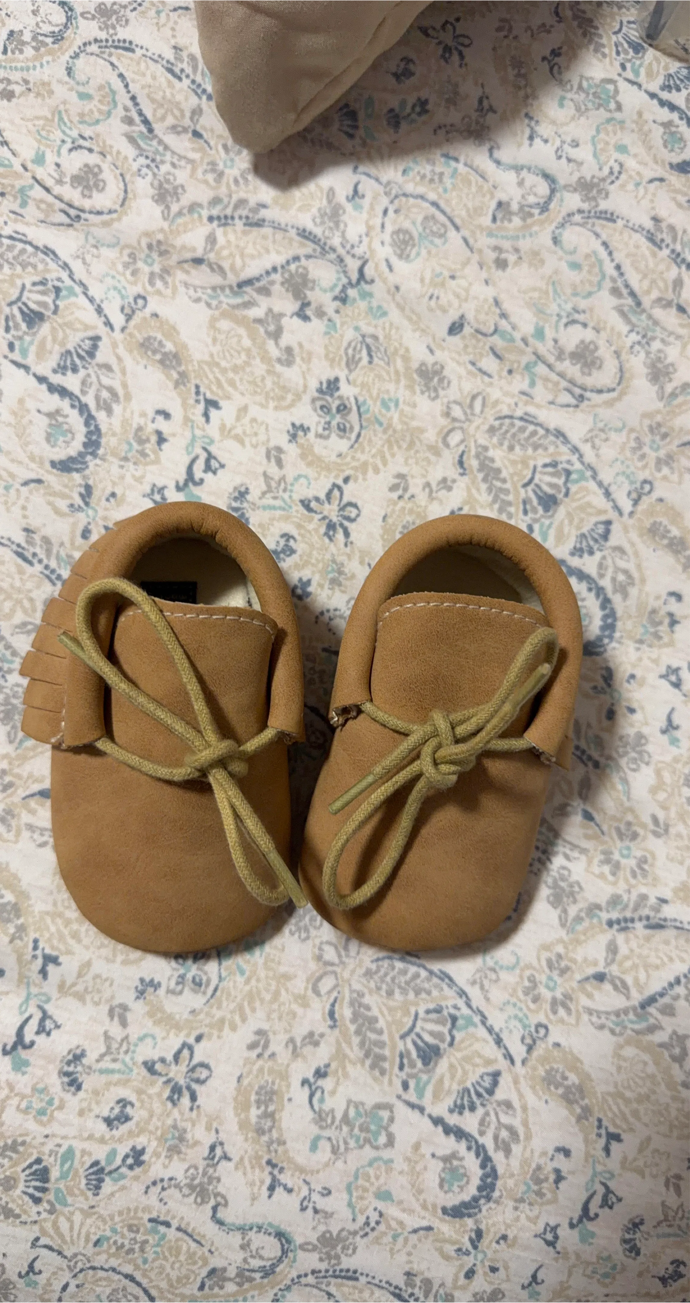 These adorable brown baby moccasins are in great condition! They have a cute fringe detail and tie closure. Perfect for keeping your little one's feet cozy and stylish