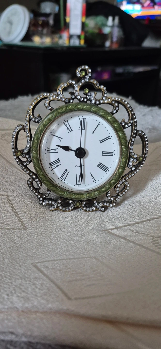 Here's a lovely decorative quartz table clock! It has a unique design with a green and gold colour stone scheme. The clock face features Roman numerals. It would be a pretty great addition to any room!