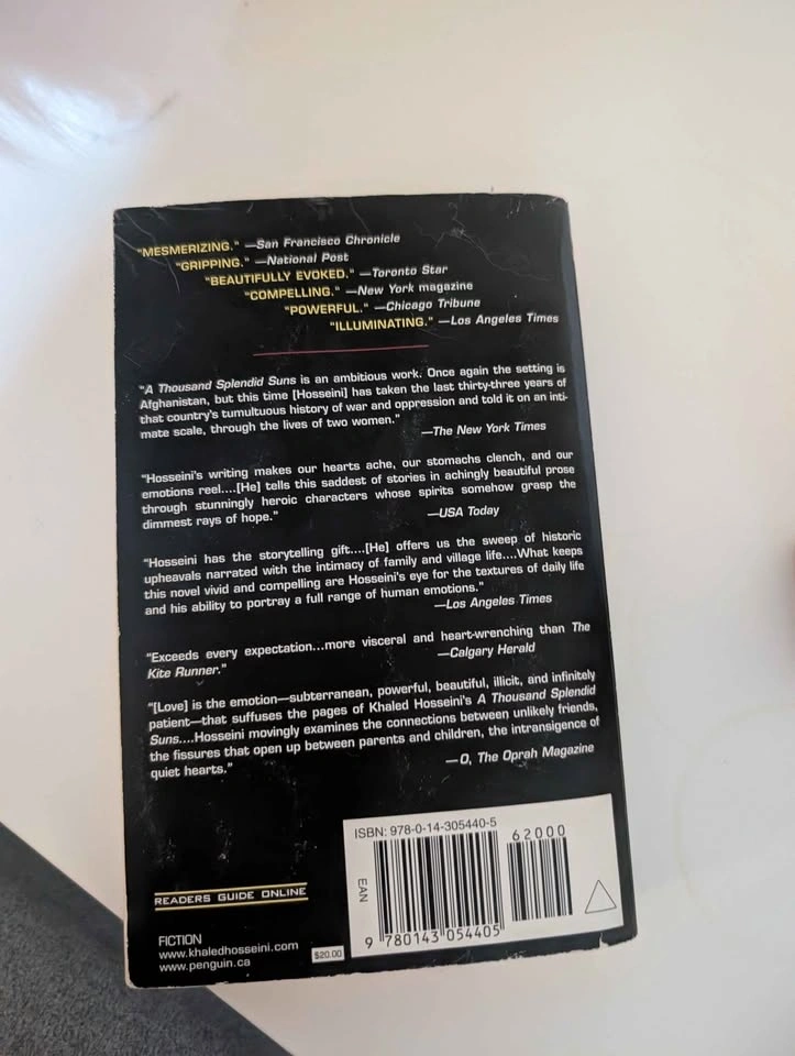 Paperback edition of international bestseller by Khaled Hosseini. Book has cream-colored pages and Penguin logo on front. Cover is multi-colored with landscape imagery. There are signs of use but still in good condition. No markings, no annotations. One of my favorite books. Meet Up: Spadina Subway station. CASH ONLY.