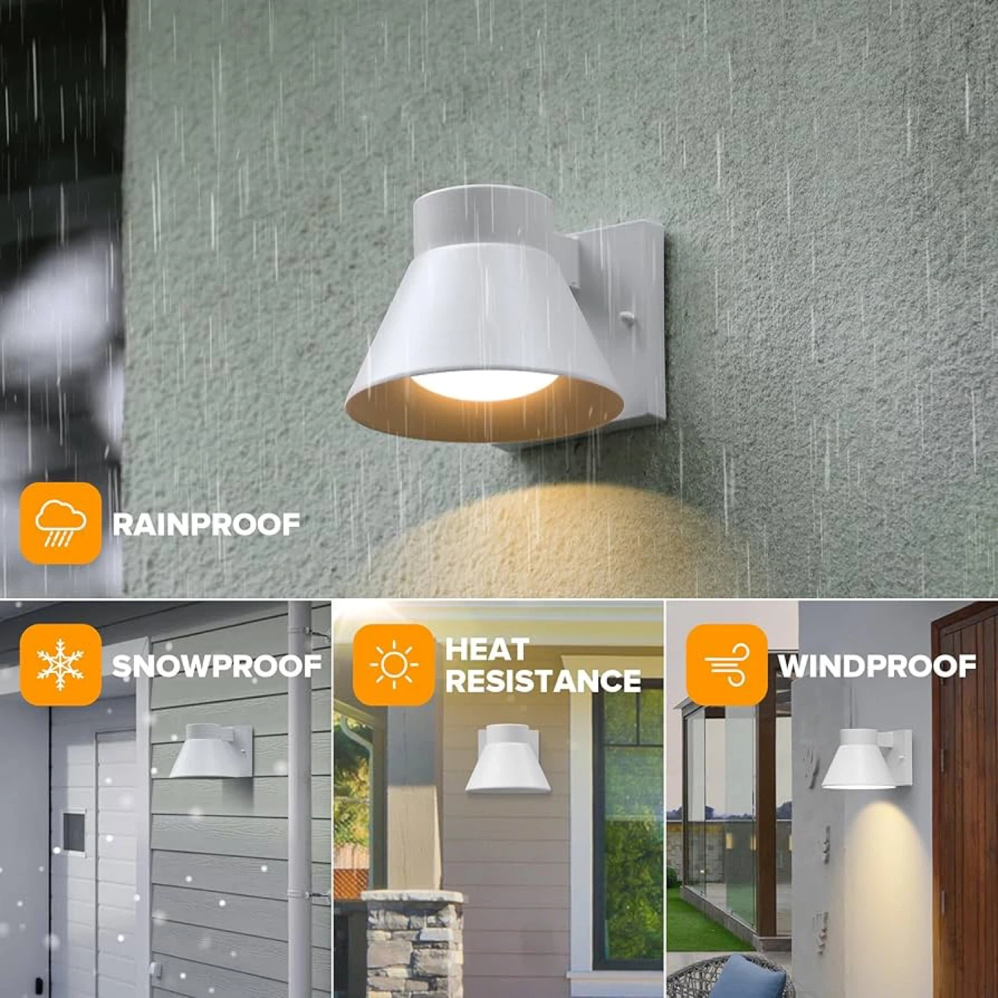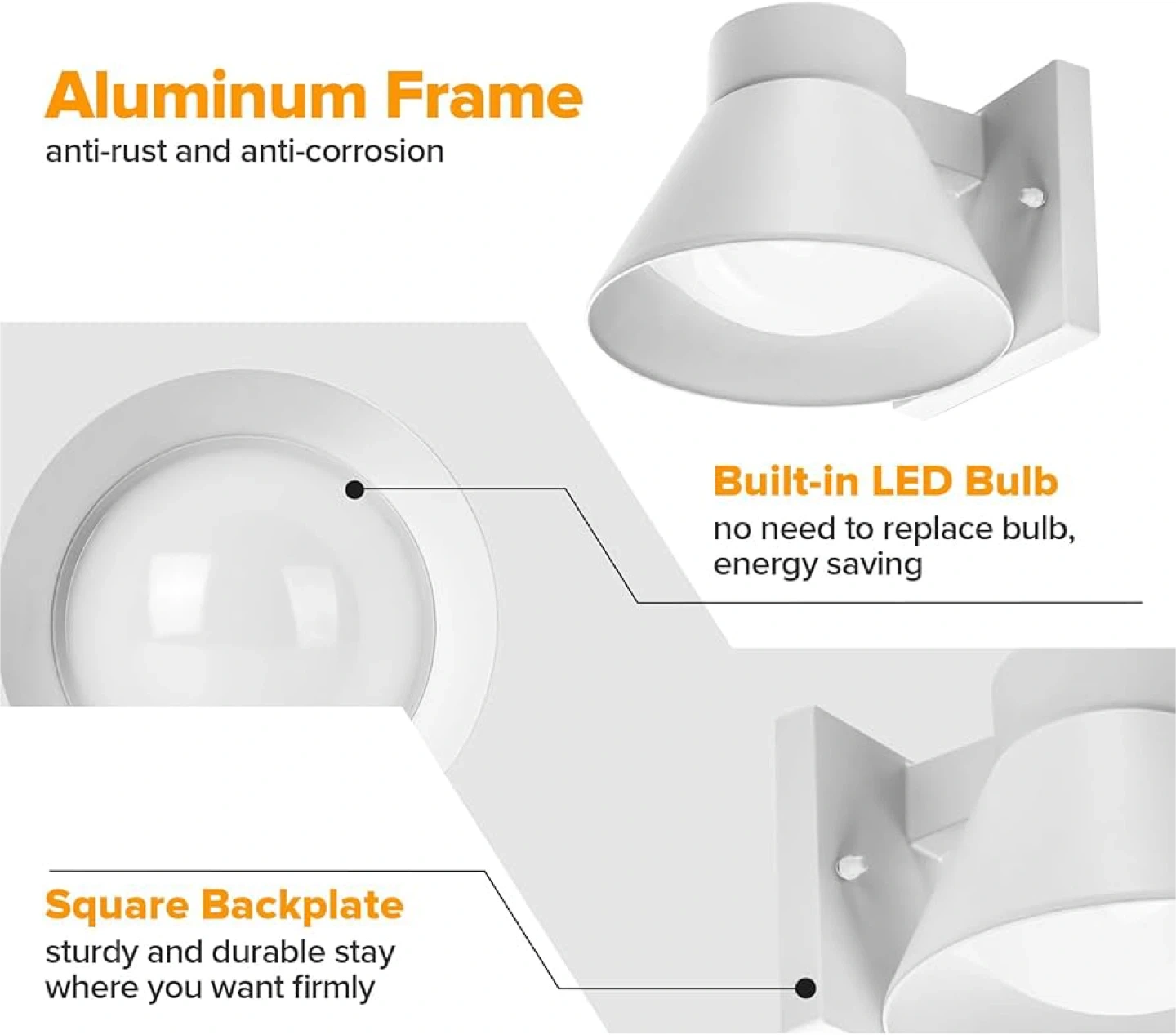 This brand new white outdoor wall light fixture is built with an aluminum frame for anti-rust and anti-corrosion properties. It features a built-in LED bulb that's energy saving and doesn't need replacing. It's rainproof, snowproof, and windproof, making it suitable for various weather conditions. The fixture measures 6.97 inches in width, 4.72 inches in height, and extends 6.22 inches from the wall.