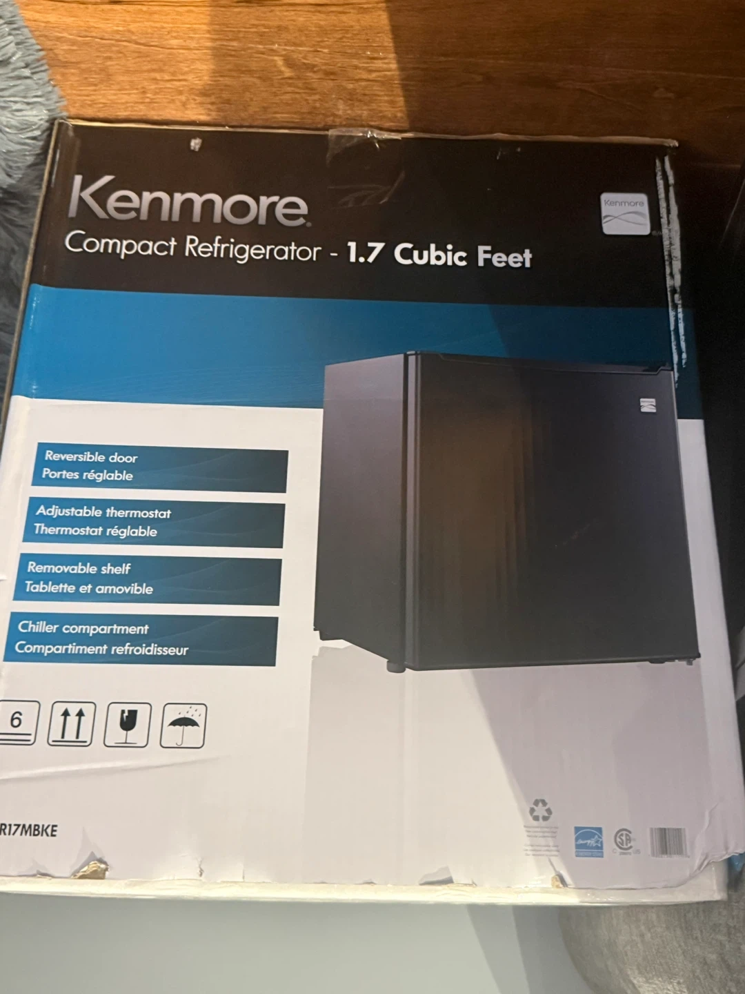 Selling a Kenmore compact refrigerator with 1.7 cubic feet of space! Brand new, never taken out of the box and ready to keep your drinks and snacks cool. It features: