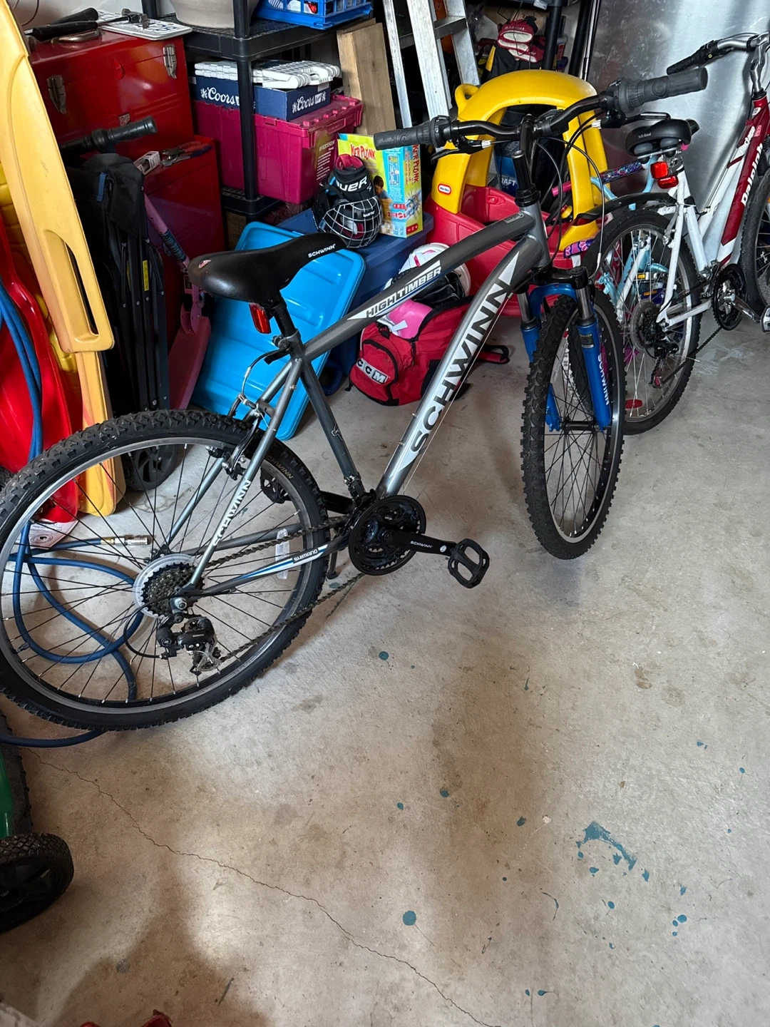 Grey Schwinn High Timber mountain bike. It's a 26-inch bike with a sturdy aluminum frame. Great for hitting trails or casual rides!
